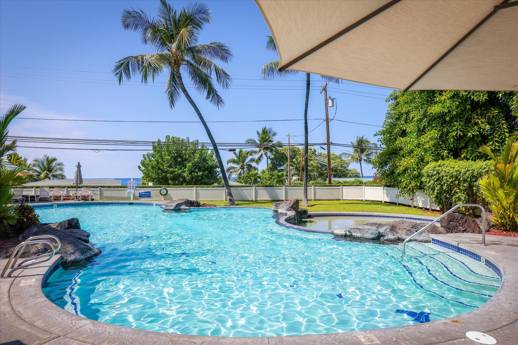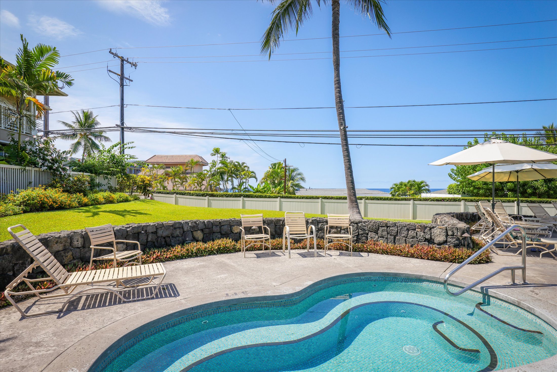Alii Cove is located between Alii Drive and Walua Road, enjoying a convenient location to Kona town, beaches, outdoor & indoor restaurants and grocery shopping. At the top of Alii Cove is this beautifully kept condominium, with special features such as an outdoor landscaped patio with ocean views, turn key furnished 3 bedroom and 2 bath, central A/C, designed with spacious closets, pantry, and kitchen cabinets. 1st floor and end unit adds to the desirability of the private location and quality condition inside and out. Salt water infinity Pool, hot tub with spacious exercise room and dining area for outdoor BBQ dining, adds to the island life-style we all appreciate.
