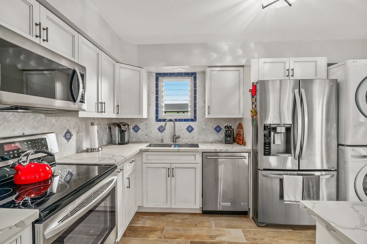 Now, this home comes totally turnkey with an automobile. A completely renovated ground floor corner unit with a lot of open grassy area and privacy is now available. It feels like your own back yard .You can bring your dog. The corner units rarely become available . The trade winds blow right through the home. Kitchen, bathrooms, windows and much more have all been redone. The primary Bathroom has a rainfall shower panel with 6 body jets .There is a large lockable owners closet. Enjoy relaxing on the outdoor lanai with views of the jungle and distant mountain vistas. Private pool for everyone to enjoy. Just a 5 minute drive to the New One Hotel and the Princeville shopping center. The home was a full time vacation rental up to 2018, however now it is only part time as the current owners reside there more.