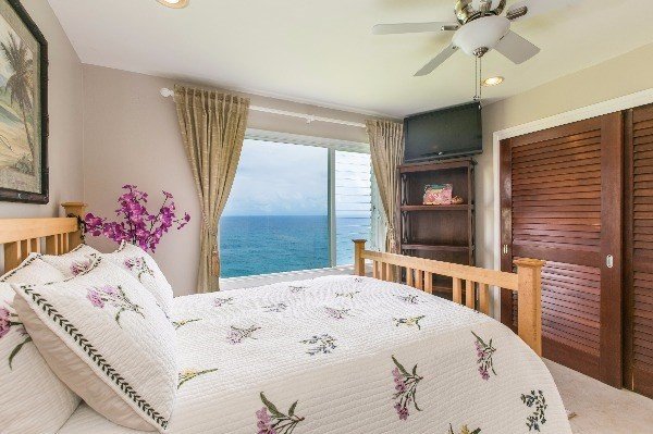 Sunrise View + wall to wall ocean views from every window. Watch the whales, dolphins and turtles splash and play as the sun rises over the North shore. Relax on the point with the most expansive views at Alii Kai! Waves breaking on the reef while the trades pour through your windows. This condo has no stairs to enter but is on the second floor oriented on the highly sought after "point" overlooking the point. Granite counters, tile floors throughout. Open floor plan and beautifully updated. Sit anywhere in the hale and enjoy ocean. Can come furnished. Wall to wall tile throughout, upgraded bathrooms with stone floors and granite. No stairs, just walk right in! Life on the bluff is magical and at Alii Kai you have ample parking, a quiet environment, very healthy HOA with the lowest dues for Oceanfront on Kauai!