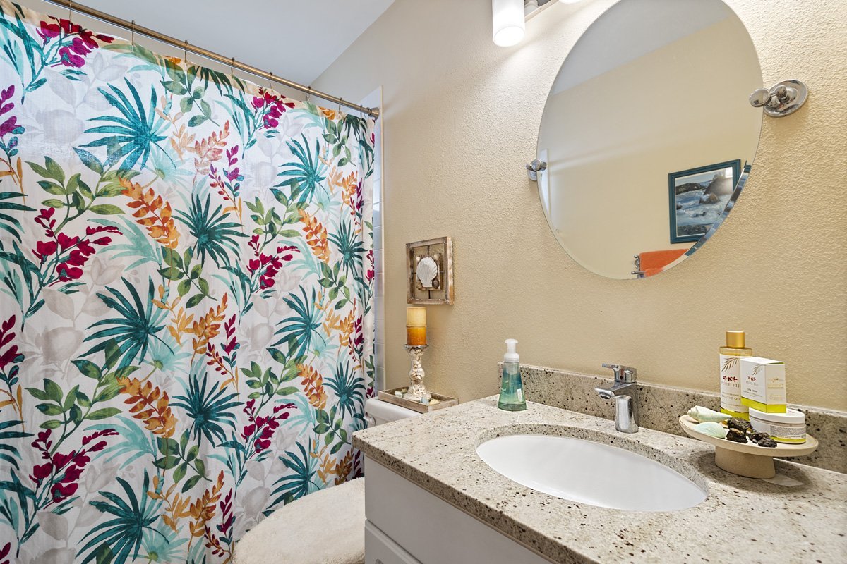 Highlights: ~ Custom Granite Counters in Kitchen with large pantry and eating nook ~ Stainless Steel appliance package ~ Vaulted Ceilings ~ Upgraded Ceiling Fans ~ Primary bedroom with ensuite bath ~ New stackable Washer\Dryer unit ~ Luxury Vinyl Plank flooring in kitchen and baths ~ Two parking spaces located near front door ~ Custom paint throughout ~ Lanai with open views of lush tropical landscaping ~ Ample Lanai Storage closet for beach accessories etc.
