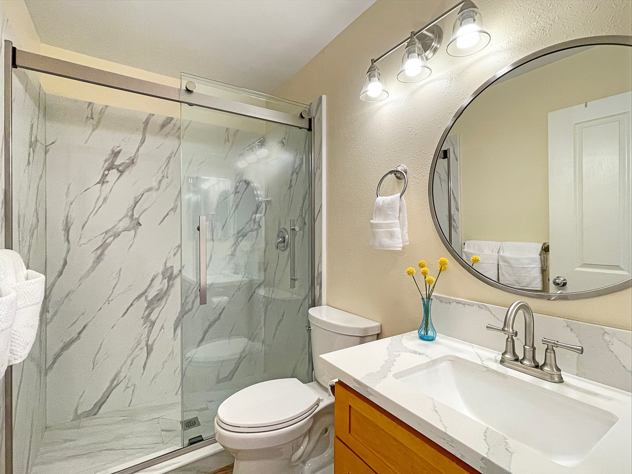 Features include: new kitchen and bathroom cabinetry and quartz countertops; new vinyl plank flooring throughout; new shower/tub surrounds, bases & doors; pantry closet; stacked washer/dryer unit; large closets; and window A/C units.