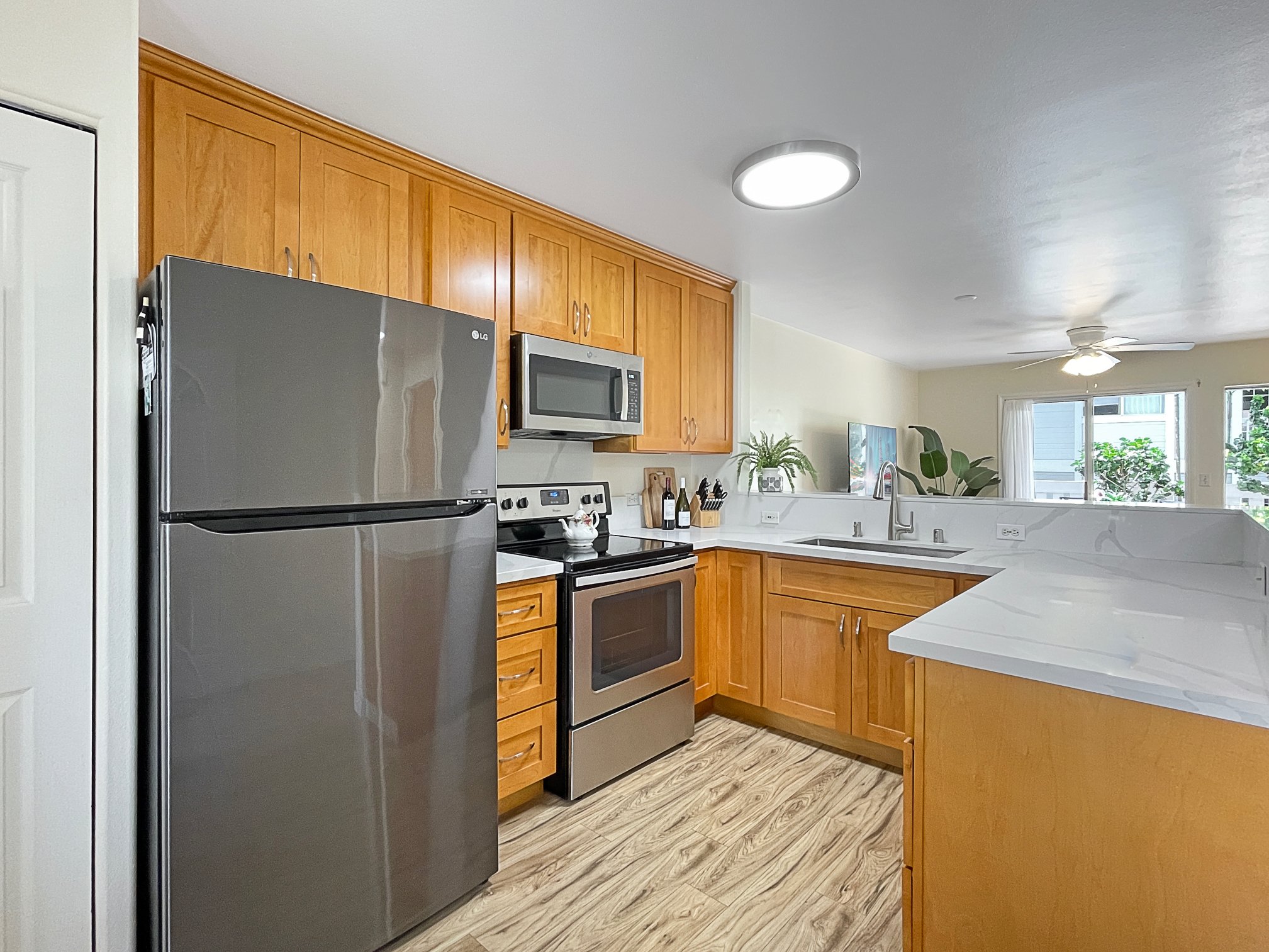 Recently remodeled in 2023, this ground floor 2-bedroom, 2-bathroom unit is located in Ali'i Lani Condominiums in the heart of Kailua-Kona and just yards from the ocean. Spend quality time with friends & family on the large rear lanai, enjoying meals, morning coffee and other refreshments.