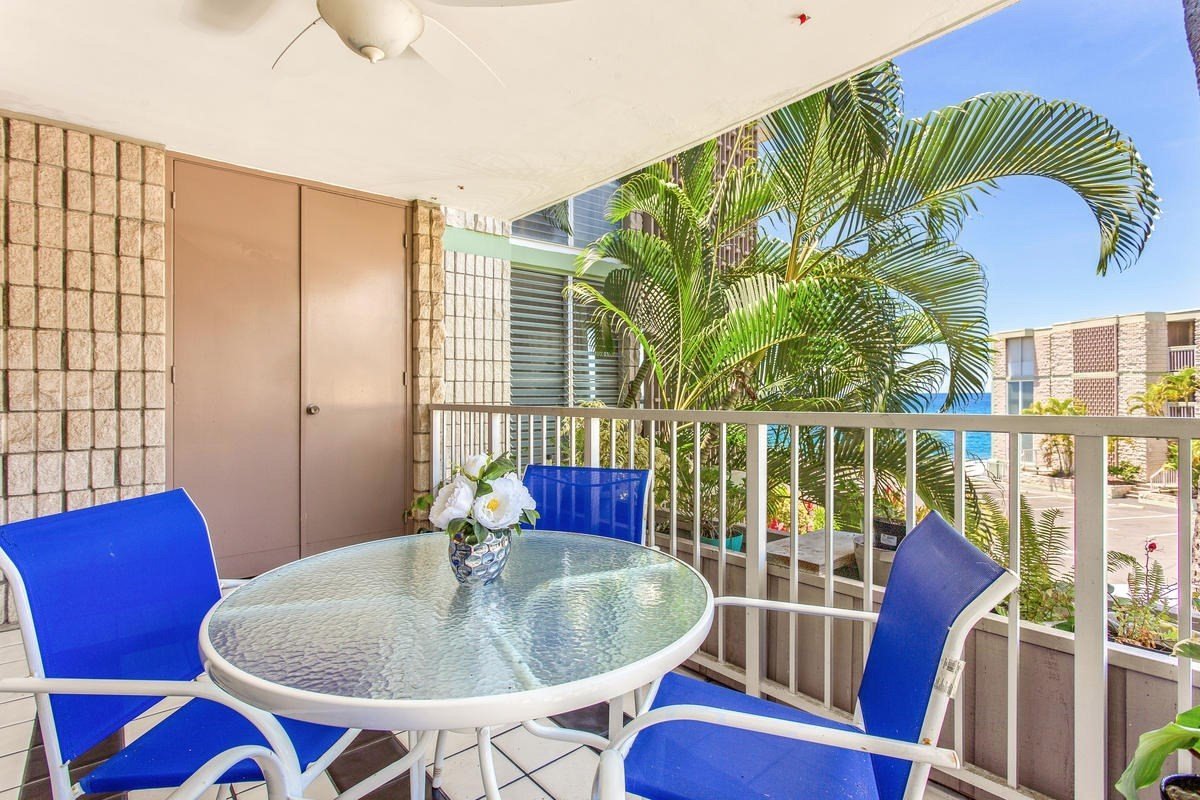 Alii Villas is located just a short distance from downtown Kailua Kona along the oceanfront side of Alii Dr and is a well maintained concrete condominium complex. The grounds are lovely and amenities include a solar heated pool and outdoor BBQ deck with ocean views. This second floor unit has a nicely upgraded kitchen with wood cabinetry, solid surface counters and lighting. There is tile flooring in kitchen, bathroom and on lanai, with berber carpet in bedroom and living room. This unit has been owner occupied and lovingly maintained for over 25 yrs, however there is a wonderful opportunity to make additional upgrades and add your own creative touches! The parking stall for the unit is positioned close by and there is a good size storage closet on the lanai for beach gear and misc tools and such. On a side note, the property is zoned Hotel/resort so STVR (short term vacation rental) is an allowable use.