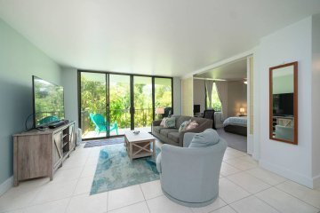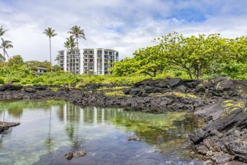 The grounds feel like an oasis surrounded by palms and fragrant plumeria trees. A short walking path leads to a stunning tide pool frequented by sea turtles. Residents can also enjoy an enclosed outdoor pool complemented with loungers and tables.