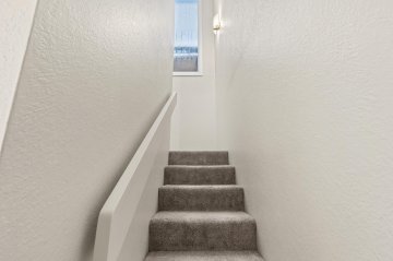 Offering a peaceful ambiance, the complex is beautifully landscaped with ferns and vibrant crotons. It comprises four two-story buildings. The two-story townhomes range between 1,200 and 1,299 square feet. Floor plans are identical, with the living area and one bathroom downstairs and the three bedrooms and two additional bathrooms upstairs. Under-stair storage helps maximize space.