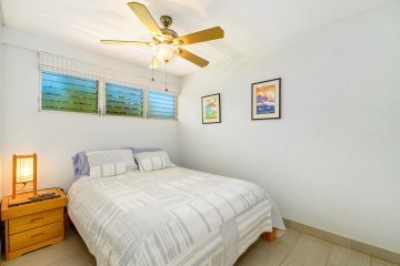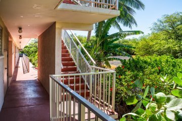 The one to three bedroom units’ interiors range from 486 to 920 Sq Ft with a lanai outside. Thirty-four of the thirty-eight condos are three bedroom floor plans, with the rest made up of two each of one and two-bedroom layouts. Owners get one parking stall and the building has an elevator to serve all floors. Air conditioning is done through window units and ceiling fans that residents have installed themselves.