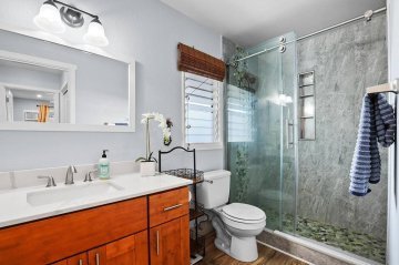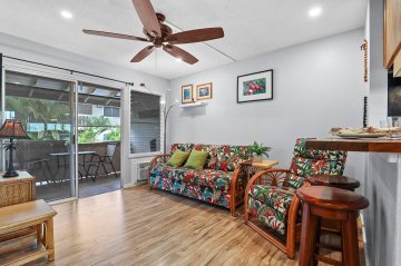 These one bedroom condos have interiors of 524 Sq Ft with one lanai exterior. They do not have washer/dryer inside, so residents use the on-site, cashless laundry facility. Each unit has one assigned, uncovered space for their parking. These residences all have ceiling fans throughout to cool the inside. Both buildings are walk-ups, there are no elevators in the complex. A very few of the residences have peekaboo to partial ocean views.