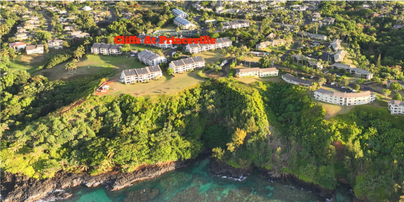 Opened in 1980, Cliffs at Princeville spans 21.16 acres with 202 one- and four-bedroom units in 10 3-story buildings. About 130 yards from the ocean, this resort-style property offers condos from 917 to 1,864 square feet, with two to three lanais. Most are one-bedrooms, some with lofts, while four-bedrooms are two-story. Ceiling fans cool the walk-up units, and amenities include a pool, two jacuzzis, tennis and pickleball courts, a putting green, and more. Vacation rentals are allowed, with Sealodge Beach a short trek away and stunning bluff views on-site.