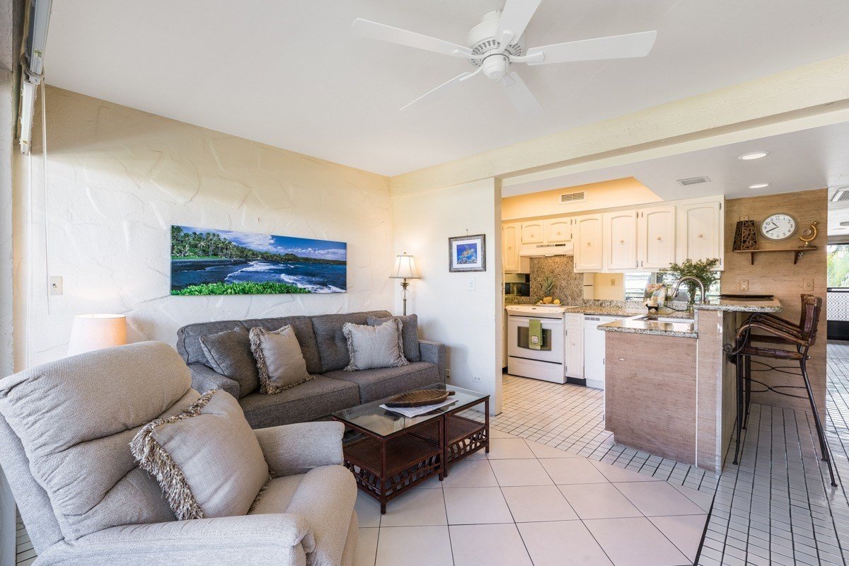 Casa De Emdeko Unit #308 offers a beautiful blue ocean view and is the perfect place to enjoy the warm weather of the Kona Coast. Located along Ali'i Drive just south of town, this gated community features many amenities including a large oceanfront saltwater-style pool, expansive entertainment pavilion, sandy beach lounging area, outdoor BBQ - all on the ocean! There is even an additional swimming pool. Unit #308 is conveniently located close to elevator for easy access and is sold partially furnished. Features include, central A/C , in-unit washer and dryer hookup, granite counter tops, tiled floors and more. Priced and sold AS-IS. Seller would like to lease back up until May 15, 2023 or 30 days after close of escrow. Bring your remodeling ideas and make this your winter escape!