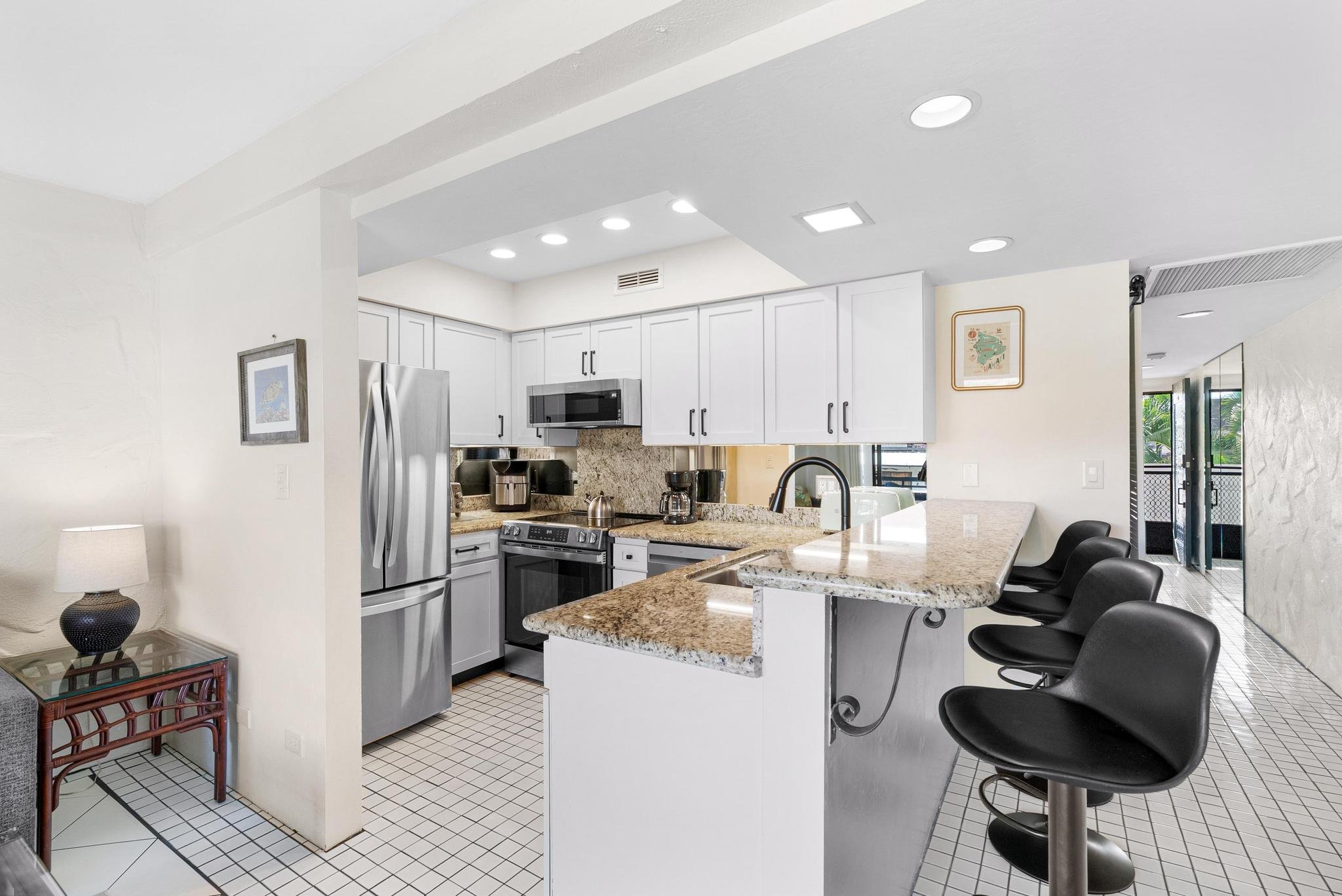 Tile flooring throughout the main areas keeps things cool and easy to maintain, while plush carpeting in the bedroom adds comfort. The lanai offers plenty of space to unwind or entertain, whether it’s morning coffee with ocean breezes or sunset views surrounded by lush tropical landscaping.