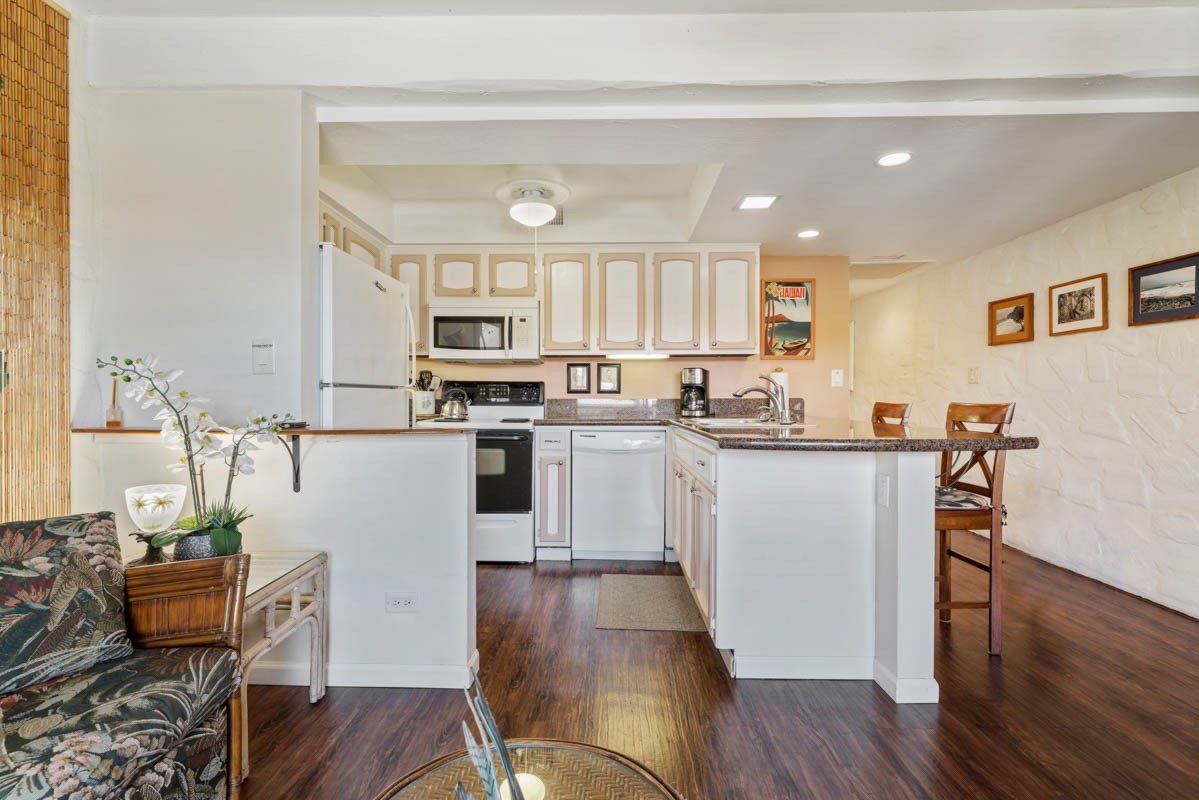 Close to shopping,restaurants,stores and all the outdoor activities Hawaii has to offer. Large open lobby overlooking the garden and center of the complex. Building has new stairs, elevators easy and accessible walk ways from parking lot. Parking is open and plentiful, secure with coded gates. On site 24/7 property manager and roaming security.