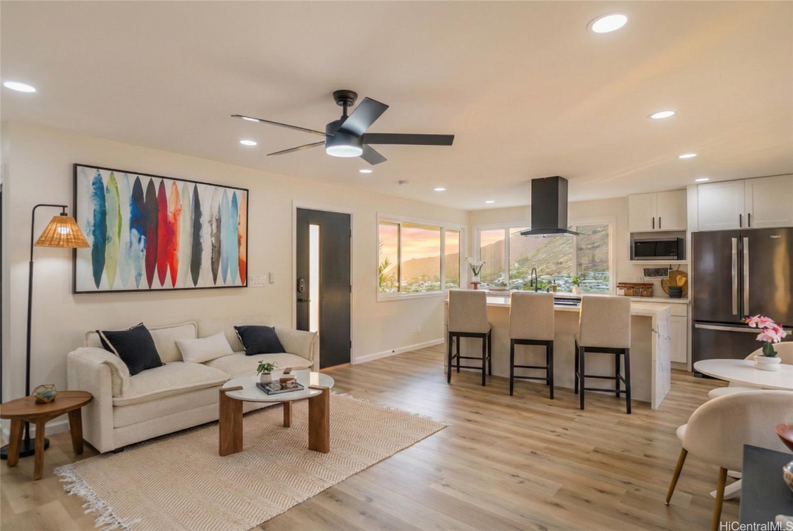 This is a unique opportunity to own a beautiful hillside home in the highly sought-after Aina Haina community. This property delivers both immediate perks and excellent long-term possibilities. Elevated above the surrounding neighborhood, the home benefits from expansive mauka-to-makai views that enhance everyday island living.In a mauka-side community like Aina Haina, structural integrity matters. The sellers have recently installed a brand new carport roof and are completing additional foundation improvements in the coming weeks. The updated list price reflects these proactive investments and the strengthened condition of the home.The main level of the home offers three bedrooms and two baths with an inviting open kitchen, newer appliances, and durable luxury vinyl plank floors. Split air conditioning systems and automated window shades add modern comfort.A lower-level studio suite with its own renovated bathroom and a convenient wet bar offers excellent flexibility for guests or potential rental income. The outdoor space features a beautifully terraced yard with established fruit trees, offering a quiet place to relax, talk story, and unwind at the end of the day.
