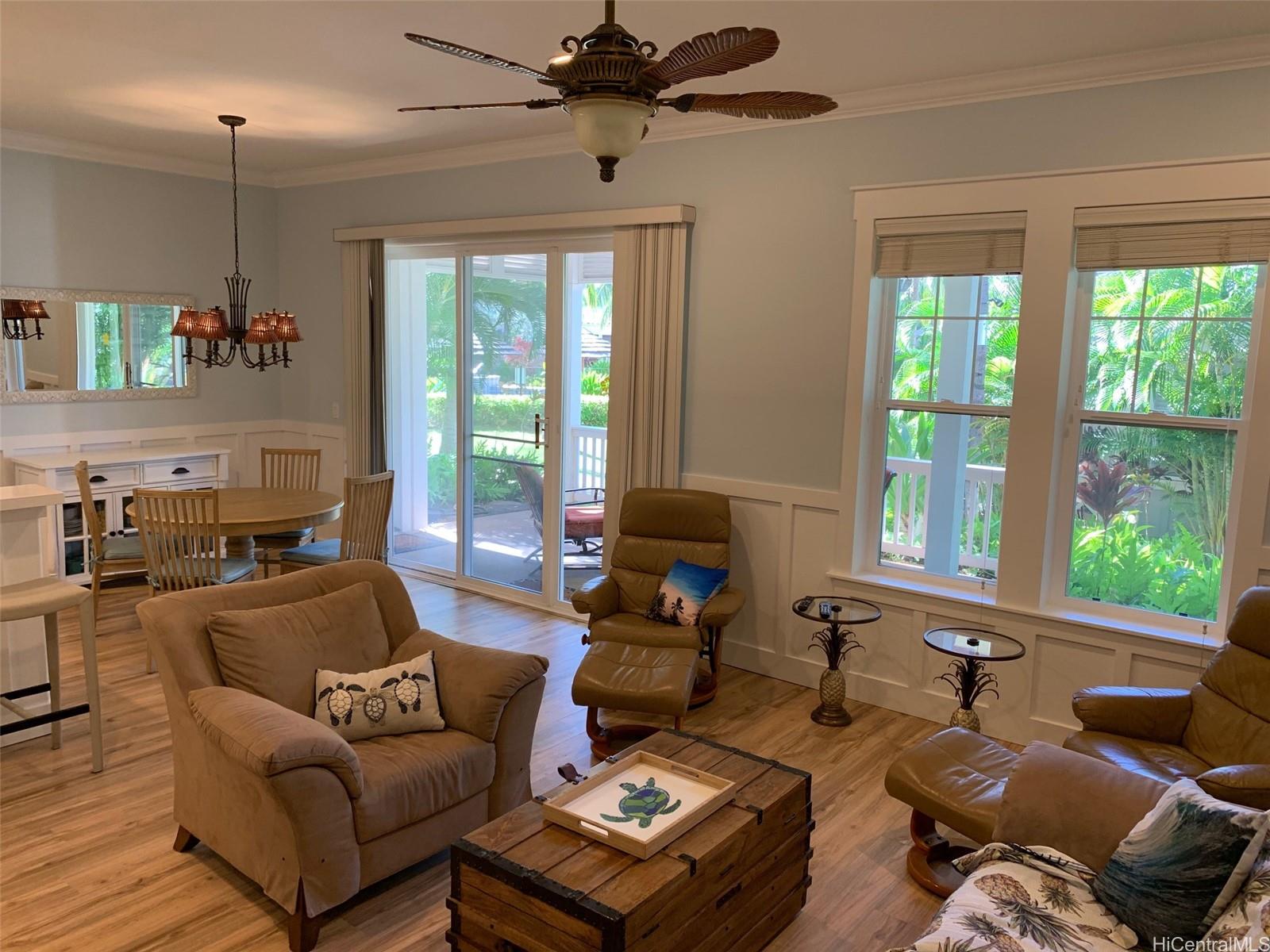 Turnkey vacation home at gated Coconut Plantation at Ko Olina. Ground floor 2-bed 2-bath Ginger model, 1 car garage, Golf Cart Garage & open parking. Lanai surrounded by beautiful landscaping and next to the pool! Excellent condition & tons of upgrades including: new A/C unit, vinyl wood floors throughout, crown molding, and ceiling fans. Super close walk to Ko Olina market, restaurants, pools, beach, golf, gym, shops, & luau. HOA fees include cable, WiFi, water, sewer, building insurance, landscaping, exterior painting/roof, gym, tennis & fitness classes. Perfect as a vacation home or investment!