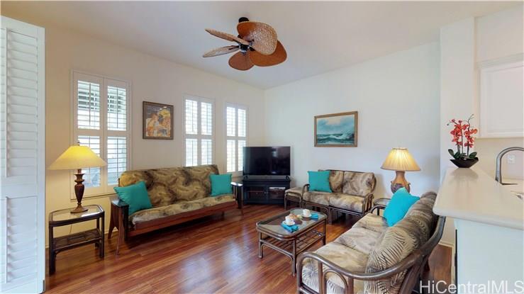 Fantastic, fully furnished, upgrade 2-story home in gated Coconut Plantation. Quiet, convenient location with lots of green space, overlooking the Hidden Spa, this 3-bedroom end unit "Naupaka" has an outdoor shower, 2-car garage, plantation shutters, crown molding, laminate vinyl flooring, fresh paint, stainless appliances, Corian countertops, ceiling fans and gorgeous furnishings with Smart TVs. Enjoy living the Resort Lifestyle! Walk to beautiful beach lagoons, excellent resort restaurants, market, cafe, gym, golf, pools & watch gorgeous sunsets! Make this lovely townhome your primary home, vacation home or investment! Be neighbors with Disney's Aulani, The Four Seasons & the future Atlantis! Floor plan in supplements. Click "movie reel" under photo for 360 Tour.