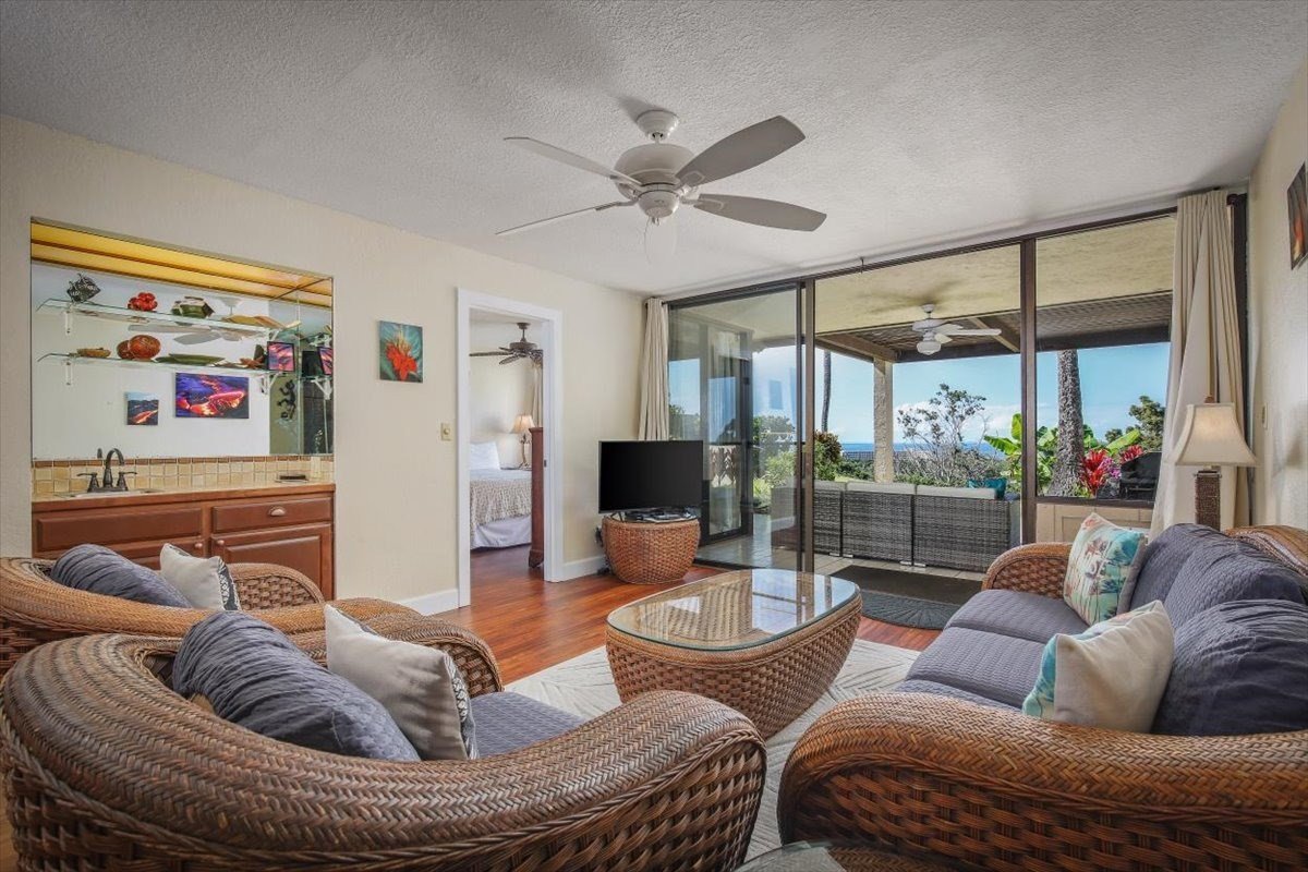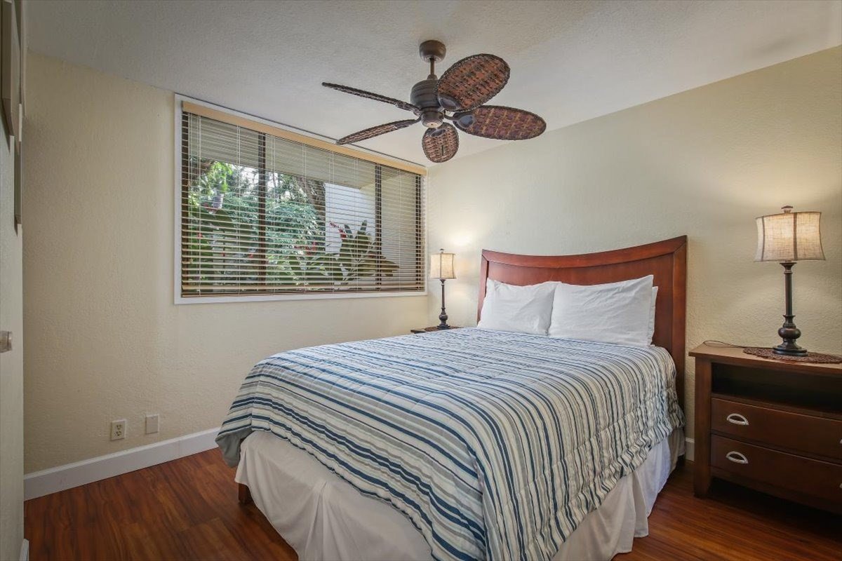 One of only two ground level units in complex with no stairs. The large covered tiled lanai where you may watch the golfers go by or just sit and relax. Fully furnished as a second home and is currently a very successful vacation rental making your investment easy. Located along the Kona Country Club golf course, the Country Club Villas' amenities include 3 swimming pools with spa, two tennis courts, lush tropical landscaping, owners' exterior storage area. Popular Keauhou Resort offers shopping, dining and services, and fishing, boating and water activities are available at nearby Keauhou Bay. - Newly installed flooring - Remodeled kitchen - Remodeled bathrooms - Tropical furnishing (sold turnkey) - Assigned parking space easily accessible near the unit - 3 pools for 116 units, the bast ratios in Kona - BBQ grills allowed on lanai Monthly maintenance fee includes: basic cable, water, trash collection, sewer, common area landscaping, maintenance of building exterior, a master insurance policy on the complex, pools/spa/tennis courts with ocean views and the services of a site manager. No pets allowed. Vacation rentals allowed with a 7-day minimum rental