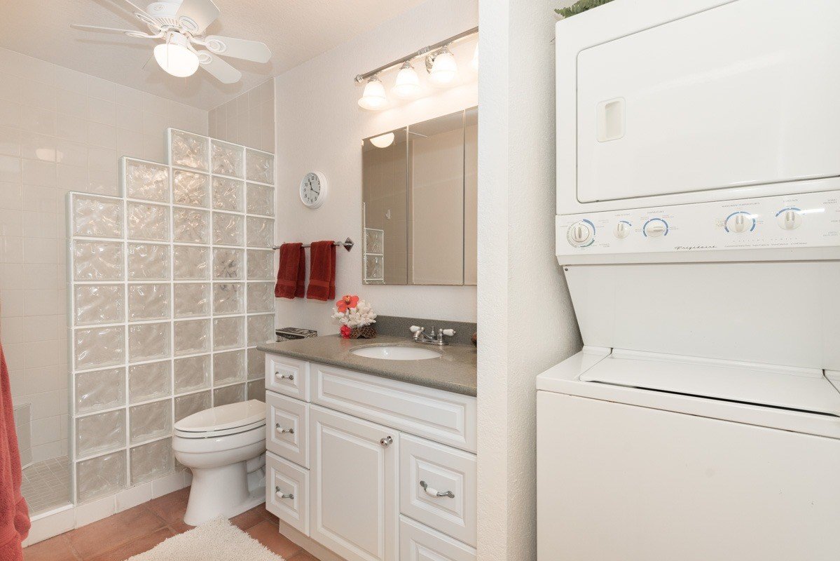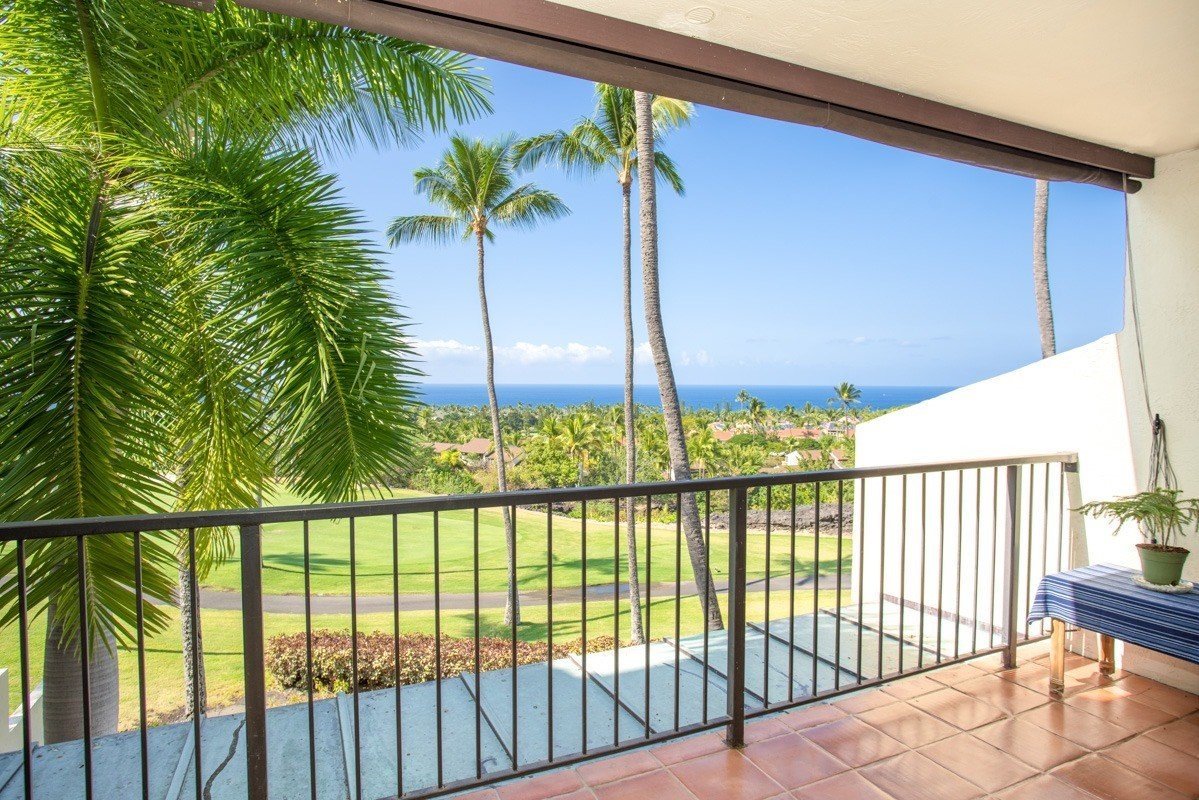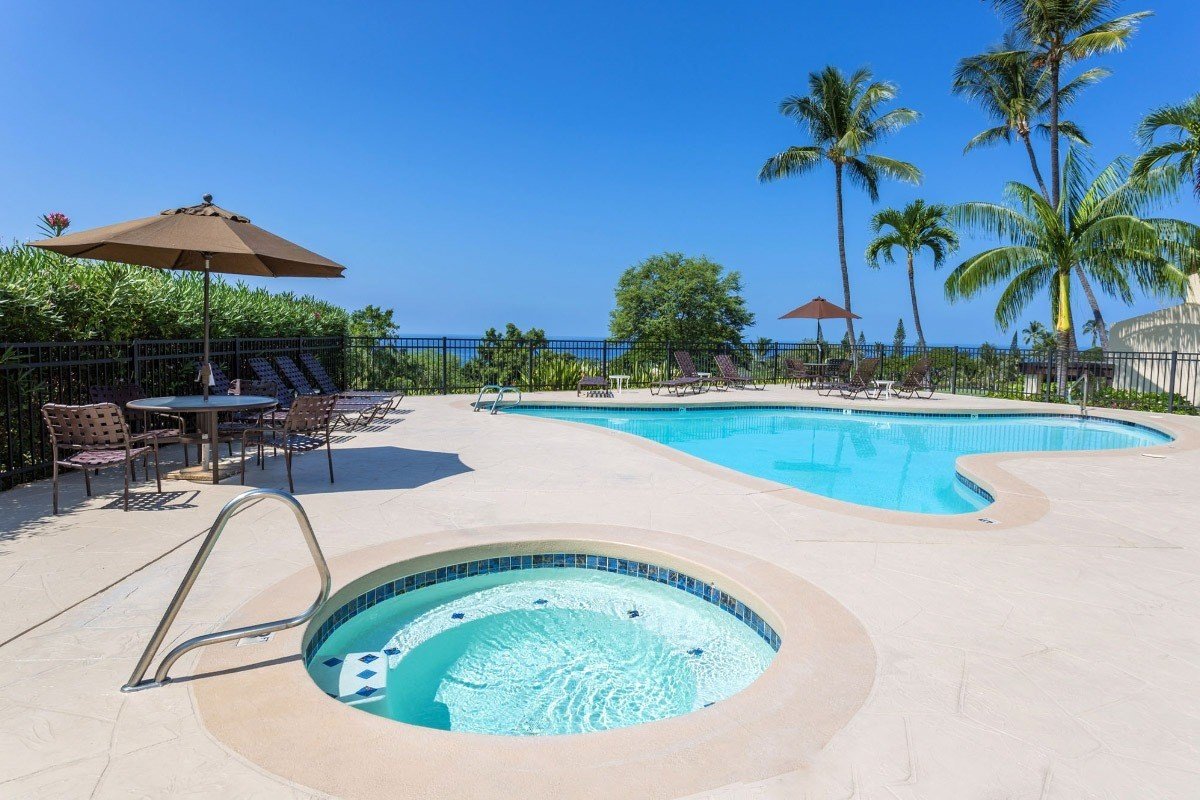 Top floor 2 bedroom / 2 bath condo with loft is fully furnished and ready for you! Enjoy ocean and sunset views, as well as watching the waves form and whales breaching in the winter. Unlike many condo complexes, Country Club Villas' residents can barbecue right on their lanai. This bright and spacious unit with vaulted ceiling sleeps six comfortably, and is the only unit with a Royal Palm off the lanai which provides natural shade. Oriented east to west, the condo receives cooling breezes all day. Country Club Villas’ amenities include three pools, each with a spa, assigned parking plus visitor stalls, 2 tennis courts, owner’s exterior storage in the breezeway between buildings. Located along the Kona Country Club golf course in the Keauhou Resort, popular Country Club Villas is close to Keauhou Shopping Center with a grocery and drug store plus other specialty shops, restaurants and theater, post office and other services, weekly farmer’s market and more. Keauhou Bay is located nearby for snorkeling, paddle boarding, fishing and sailing excursions. Just some of the condo features include: • Tiled flooring throughout the main level keeps the condo cooler and is easy to care for • Ceiling fans work to move the tropical breezes during the day, and the living room and bedrooms have individual air conditioning when needed • Kitchen has a gleaming hardwood breakfast bar and wood counter trim • En suite master bedroom has a glass slider out to the lanai, and a dual-sink vanity in bathroom • Bathrooms have been updated with solid surface counters and glass block shower enclosures • Central vacuum system • Spiral staircase leads to loft area with a wall of built-in bookshelves and two additional sleeping areas • One of a kind bonus – a pool table in the loft – you’ll become an expert in no time!