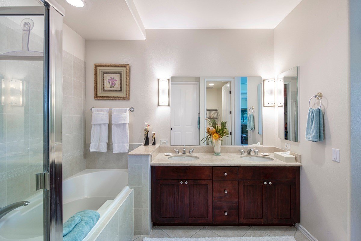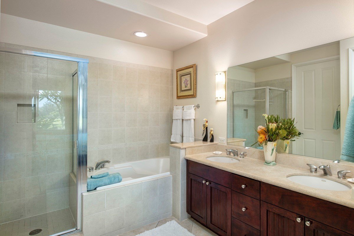 Enjoy the infinity-edge pool — NOW HEATED — overlooking golf course, Kings’ Lake, Kings’ Shops, Hualalai in the distance. Great place to watch sunset, July 4th fireworks! Hot tub, grills, fitness center, clubhouse, cabana baths — all in a tropical palm grove.