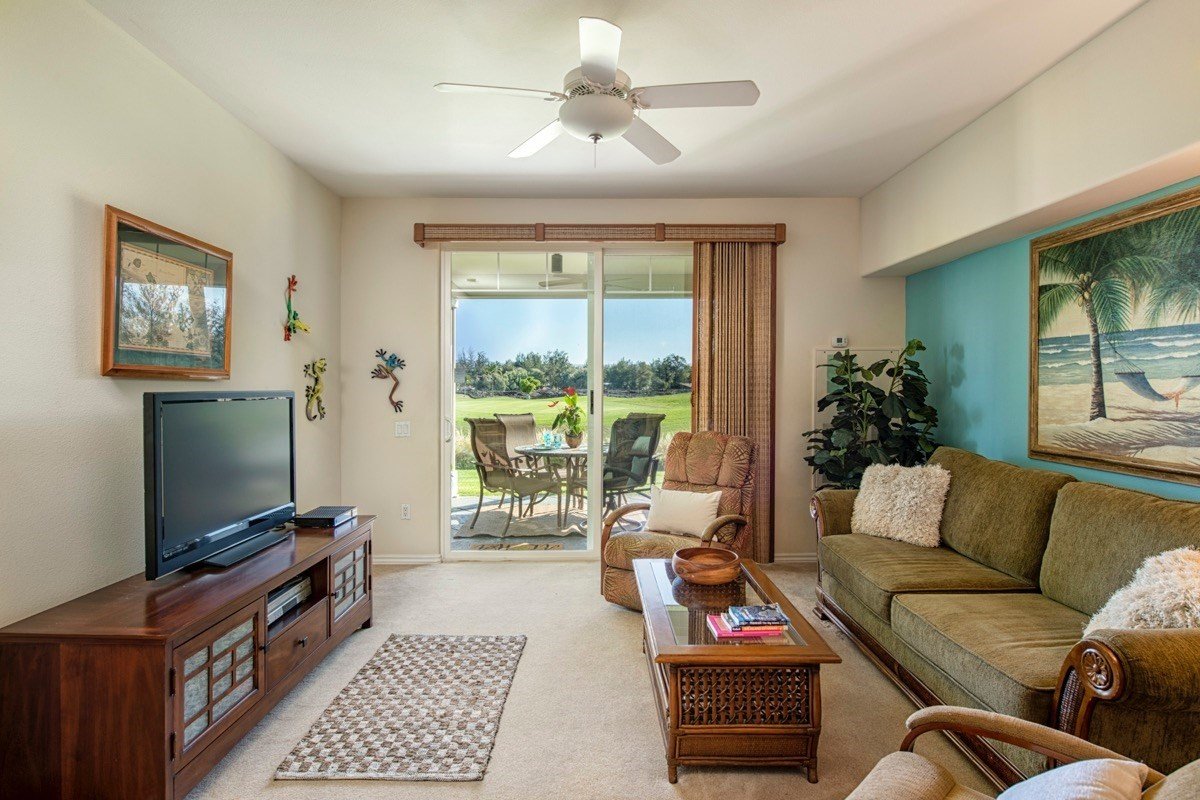 Enjoy mellow times in Fairway Villas B-4, a welcomed escape to play, relax, recharge. Owners and renters enjoy the soothing ocean colors inside and entertaining views outside. The ground floor lanai with lawn in front views the length of the first fairway, a historic petroglyph field and awesome sunrise skies.