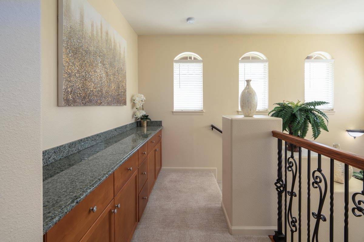 Enjoy tranquil views and a peaceful atmosphere in the living spaces. Upstairs, two additional bedrooms share a well-appointed full bathroom. The kitchen boasts wood cabinetry, stainless steel appliances, granite countertops, and a generous island. Abundant storage solutions include owner's closets, a locked tool area in the garage, and additional storage and shelving.