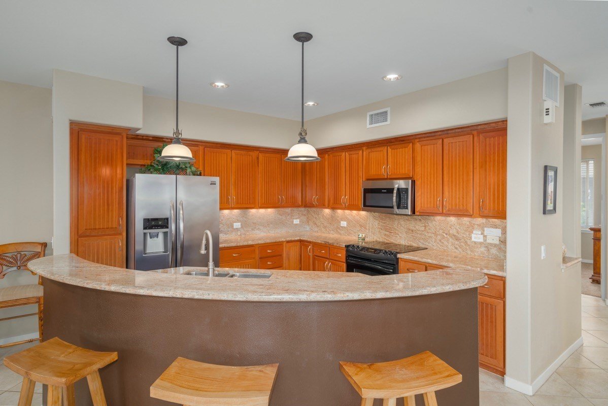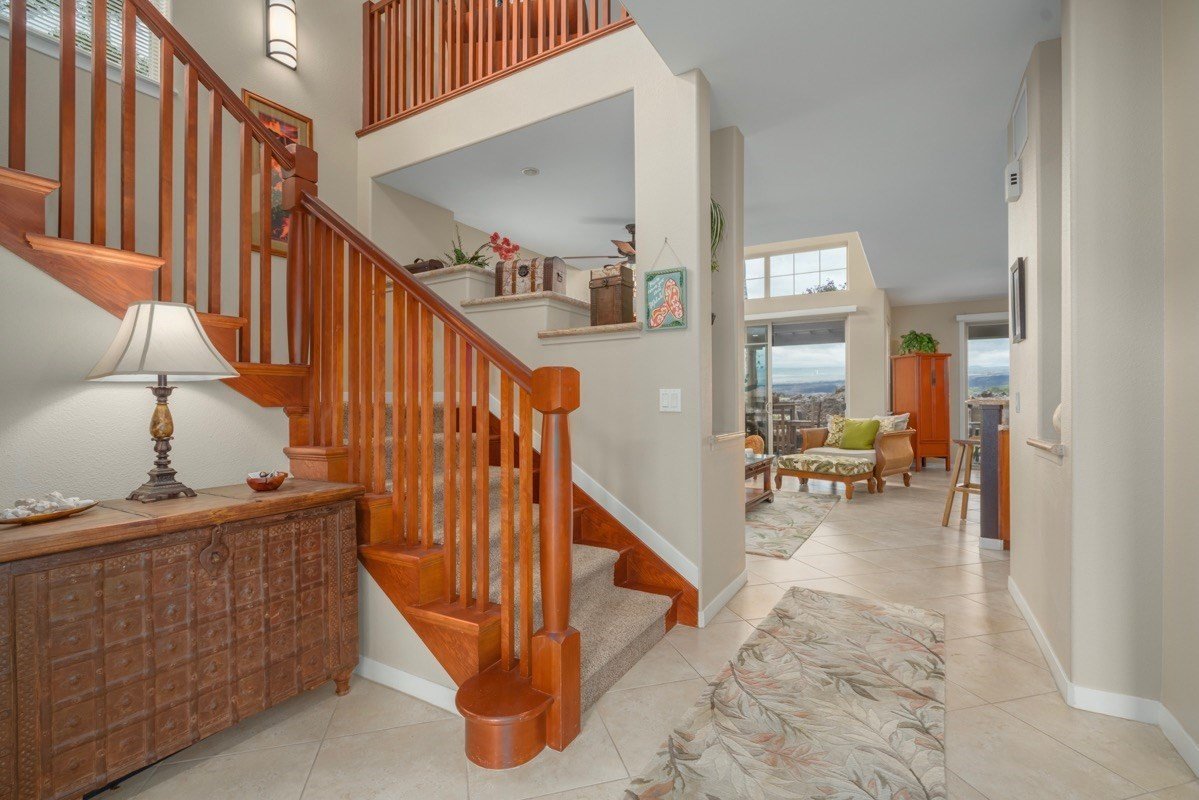 Fabulous 2-story 3 bedroom/3 bath condo in a private gated community. This professionally decorated end unit has a formal entry-way, 9 foot ceilings, extra-large windows and vaulted ceiling in the living room, adding to the open feeling. The kitchen has Granite counters, tile flooring, custom raised panel cabinets, & newer Frigidaire stainless steel appliances. The bathrooms have granite counters, custom fixtures, tile floors & showers. The upstairs main bath has a large soaking tub and tiled walk-in shower. Enjoy the central air-conditioning for climate control. Enjoy panoramic views of Mauna Kea from both upstairs & downstairs lanais.
