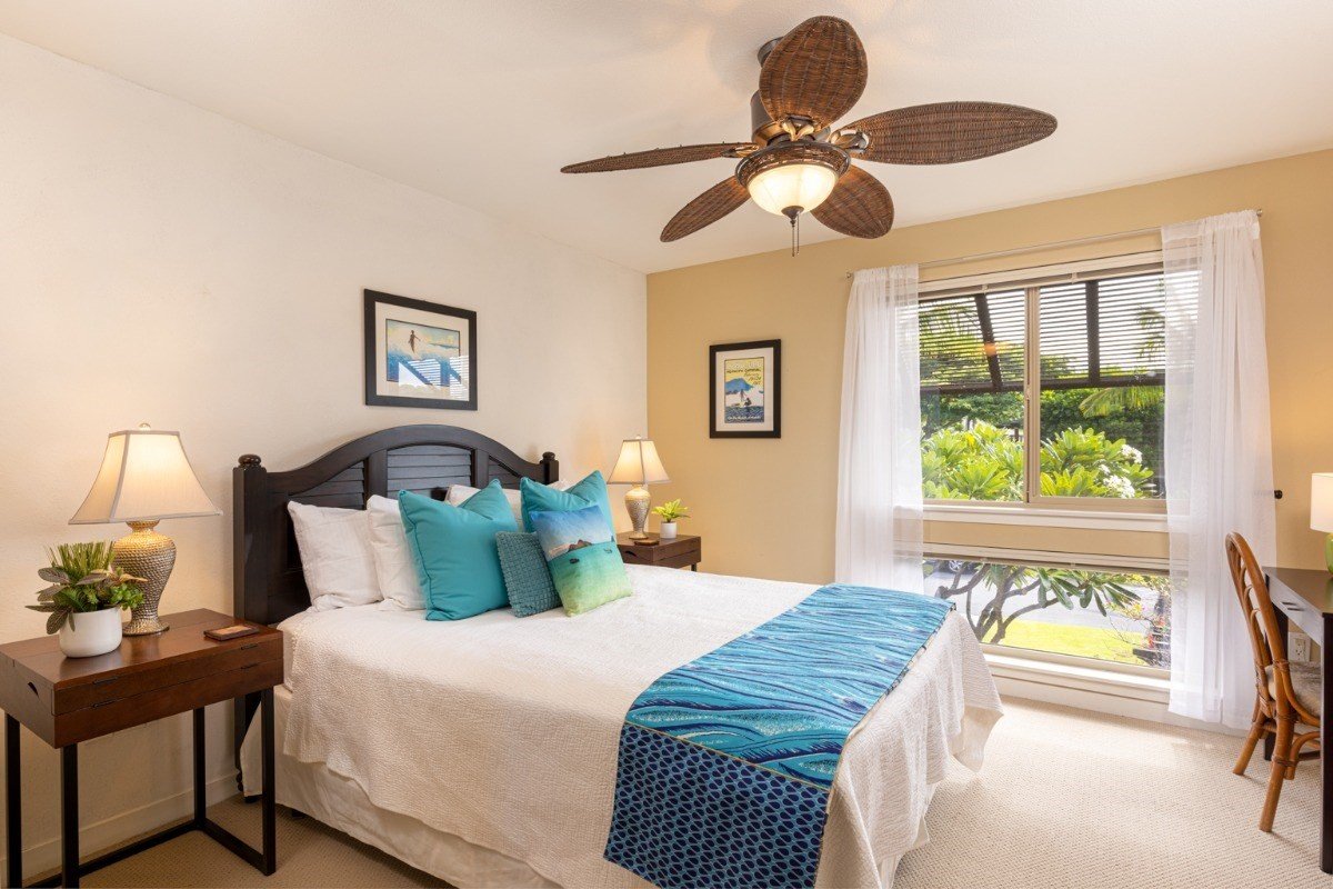 The primary bedroom, which looks out over the ninth fairway of the renowned Francis H. I`i Brown South Course, boasts an en suite bath with a soaking tub, a walk-in shower, and a dual-sink granite vanity. The second bedroom has garden views on the other end of the unit for privacy. Upstairs, an airy loft provides another inviting bonus space usable as sleeping quarters, a media/lounge room, or an office space.