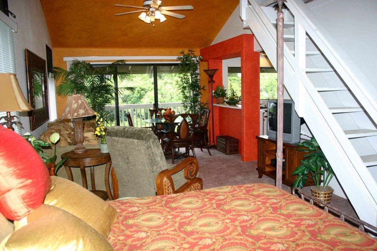 Located in the Heart Princeville on the North Shore of Kauai this upper level cottage like condo sits high on a cliff with Panoramic Mountain & Waterfall & Rainbow Views of the North Shore of Kauai from Your Living Room and Spacious Lanai! Comes fully furnished, professionally decorated Hawaiiana and Tommy Bahama Style. Just a short walk to spectacular beaches! Across the street there is a small park with a majestic view of the ocean and Bali Hai, the mountain formation featured in the movie "South Pacific" with the azure blue waters of Hanalei Bay.This condo is a lockout with high income as a vacation rental. "A" side with a cathedral ceiling, a fully equipped kitchen, an apartment size washer / dryer, 2 ceiling fans and a full bathroom with show/tub. "B" side with a cathedral ceiling, full bathroom.The surrounding area is ideal. A stunning view from the lanai of the majestic mountains behind Hanalei town where rainbows and waterfalls form spontaneously almost every day.