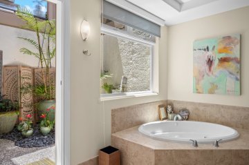 Features include stone floors, Birch cabinets, framed pocket doors, granite counter tops, 10’ high coffered ceilings with crown molding, Viking appliances, wine storage, stone showers, jetted tub, full size waster/dryer, built-in gas BBQ grill. The tasteful design and finishes befit the best luxury homes in Hawaii. The private driveway entrance, large backyard and the custom shaped pool and spa contribute to the feeling of a single family home.