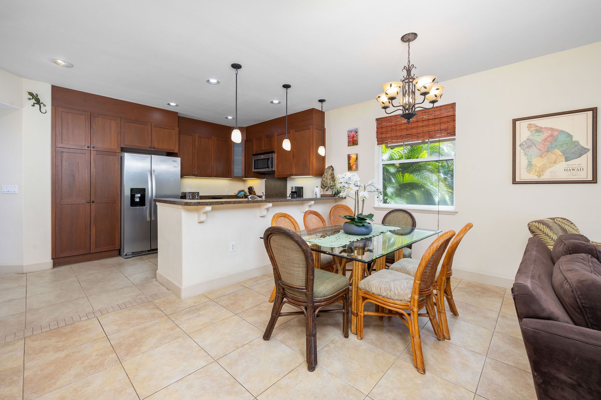 This beautiful 3BR/2BA ground floor unit opens onto a lanai that steps out to a lovely garden area. Nearby is a barbecue grill and you can relax in the hammocks. From the welcoming front door throughout the unit, this condo is a pleasure to experience. It has a tiled entryway and that tile extends to the kitchen, dining area, and living room. It's nicely furnished and turn-key, just unpack and move in. The kitchen includes stainless steel appliances. The refrigerator, cooktop, and oven have all been replaced along with the washing machine. This unit is in excellent condition.