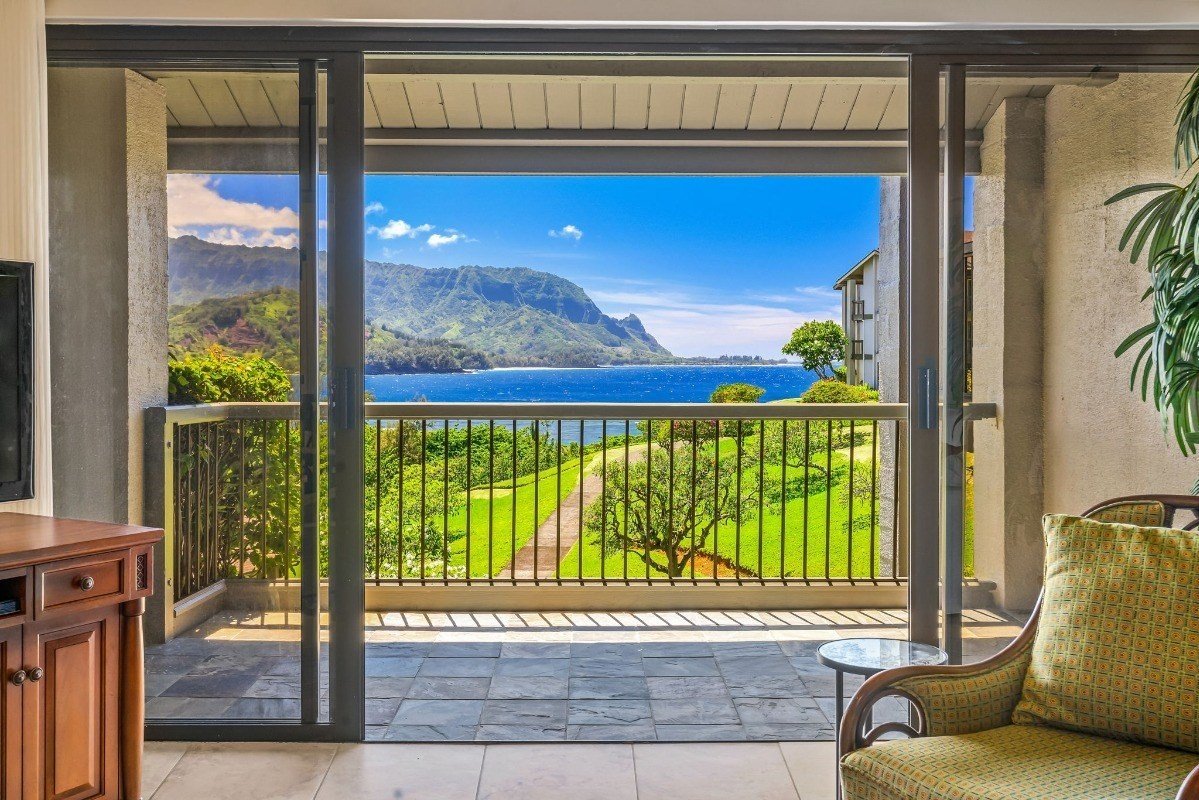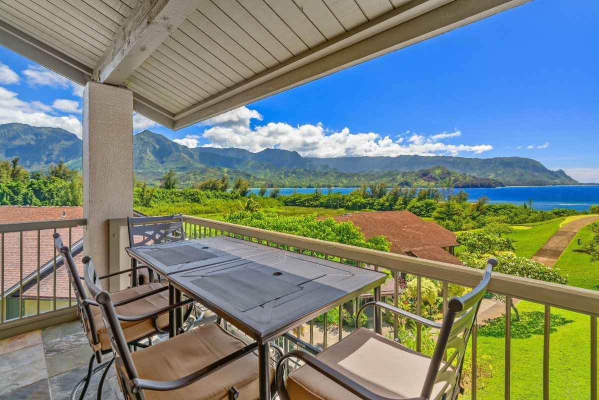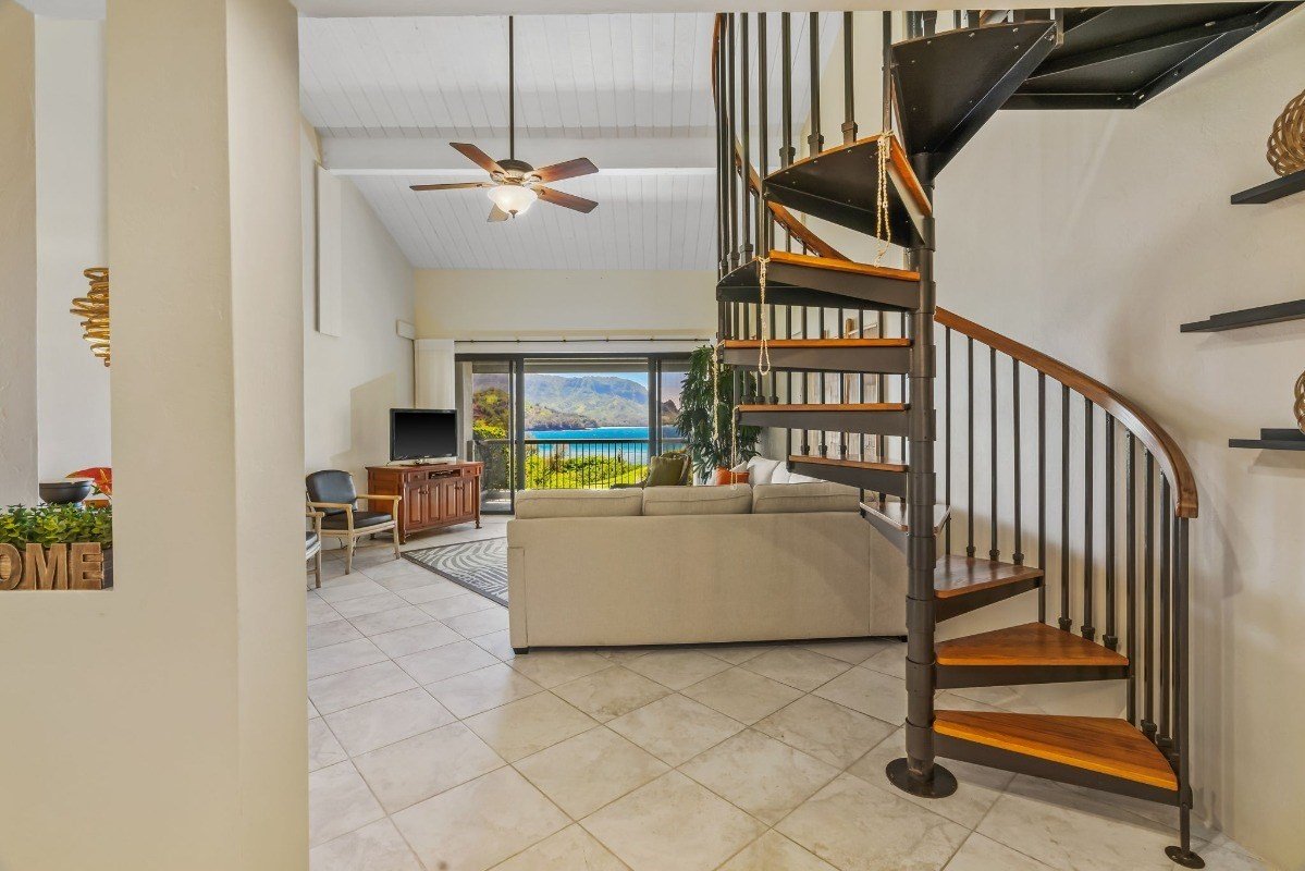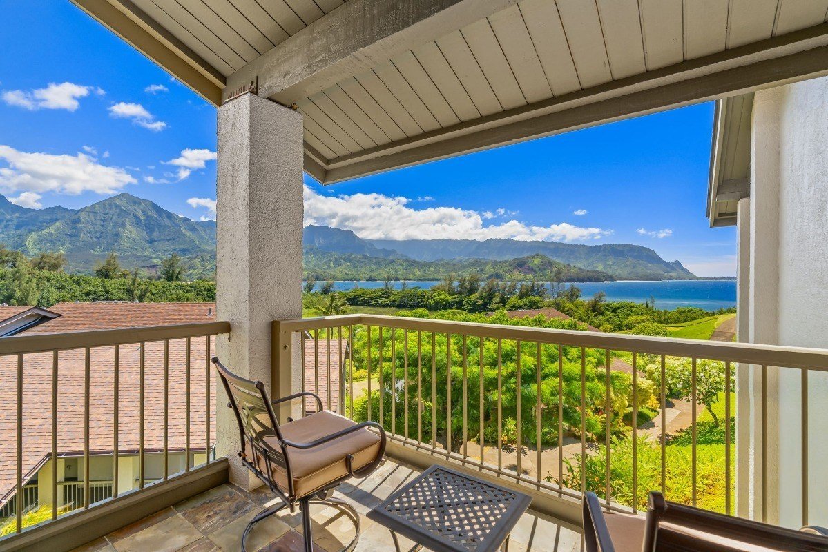 HBR 4321/22 has breathtaking, unobstructed views of Bali Hai (Mt. Makana), Hanalei Bay, Nomokalama Mountain Range and waterfalls making this top floor, 2bd/2ba condo a premier unit in Hanalei Bay Resort. Soaring ceilings throughout, with a circular staircase to a loft (adds about 200 sq. ft.) can serve many purposes such as aa third bedroom, den, or office. A large exterior closet off the entry lanai provides storage for ocean toys and other items.
