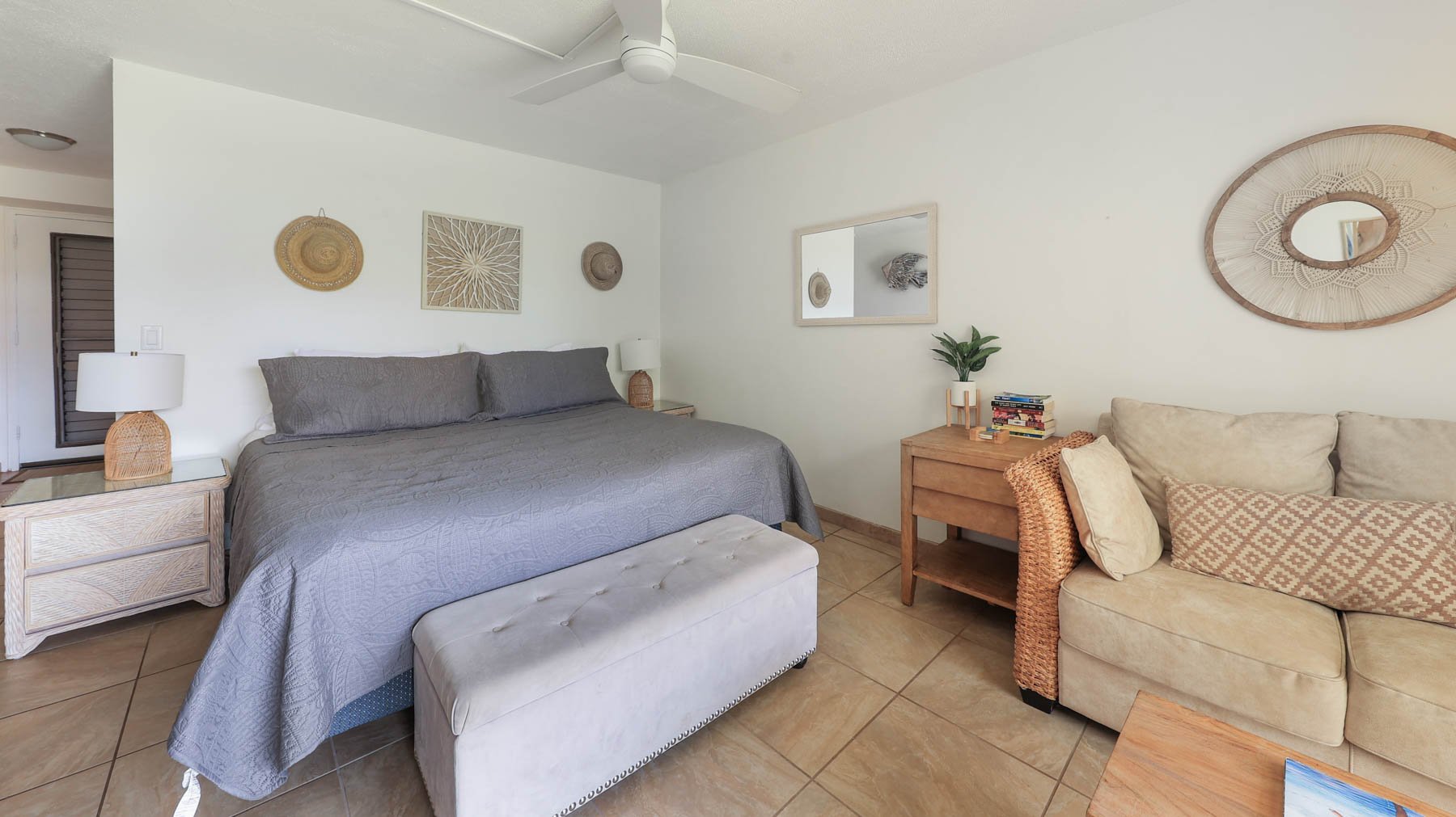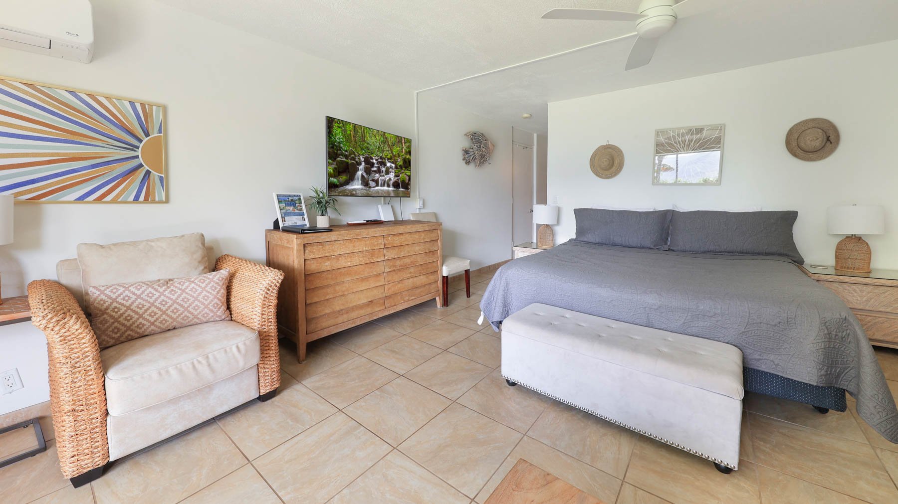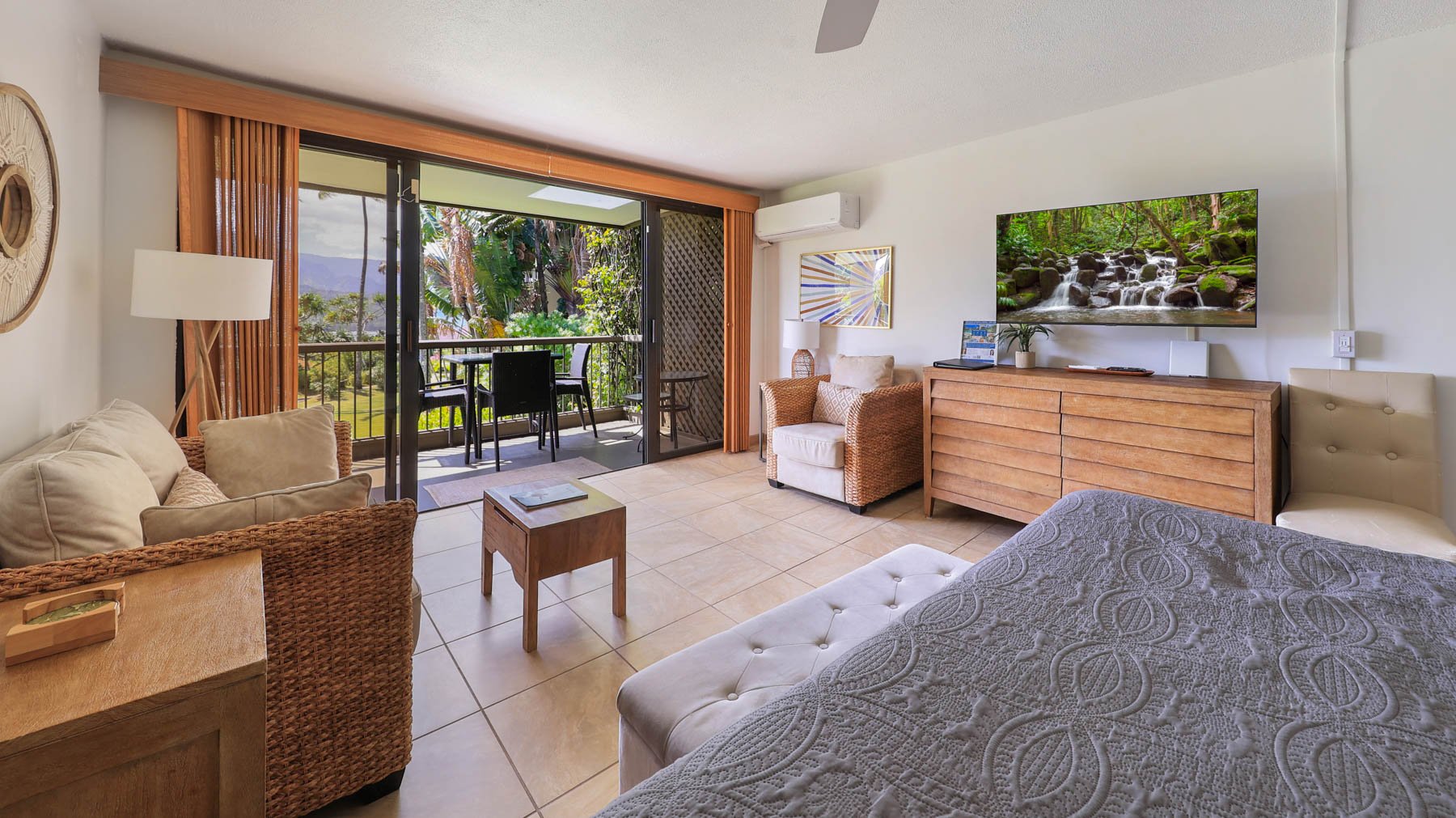 Enjoy Bali Hai water views from this renovated private condo This Vacation rental at Hanalei Bay Resort offers, Two bedrooms consisting of two joined studio rooms with private baths and one side with full kitchen. Nestled in the trees, private jungle path leads to Hanalei bay sparkling beach, lush gardens, soaring emerald mountains. Just minutes away you can enjoy the Makai Golf Course. HBR offers on site tennis, pool and restaurant. Hanalei Bay resort offers luxury and serenity - yet still close to beach trails, golf, tennis, restaurants, shopping and more. Electric, cable ,Phone, water all included in HOA fees. TWO NEW AC split systems to keep you cool on those hot summer days. See attached video tour!