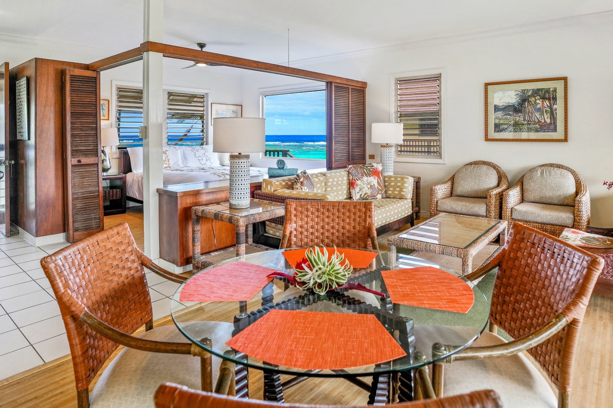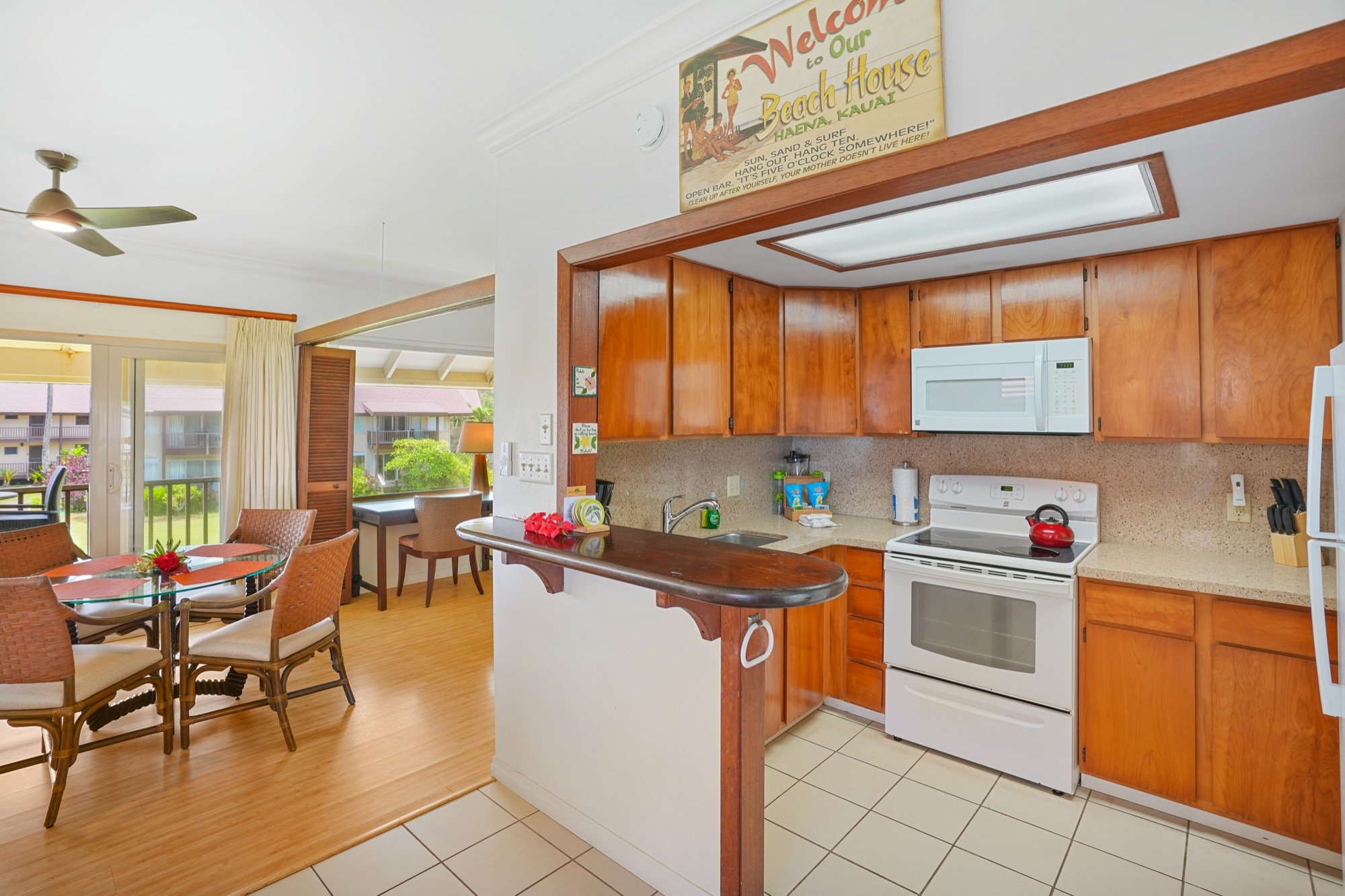 ALMOST OCEANFRONT STEPS FROM BEACH. This 2 bedroom/ 1.5 bath top floor unit enjoys multiple ocean views at the north shore of Kauai’s only beachfront condominium. View the surf and beach from every window. Its just a few steps down the stairs! A beachfront restaurant & coffee shop are adjacent to the property separated by an expansive lawn. This unit is not on the parking lot. You are only minutes from famous snorkeling beaches, Na Pali Coast trail, Limahuli Garden & Preserve and 10 minutes from Hanalei town. And when you are not out exploring, chill with the constant tradewinds and sounds of surf. The clear, tropical Pacific ocean fronts Hanalei Colony Resort with a backdrop of dramatic mountains. The experience is unlike any Princeville Resort alternatives. Enjoy the peace of mind of visiting this fully furnished, ocean-oriented property whenever you want and let the resort take care of the rest. This boutique resort is a hidden gem that truly embraces Kauai’s lifestyle with its full-service hotel/vacation on-site rental program including housekeeping and shuttle service.