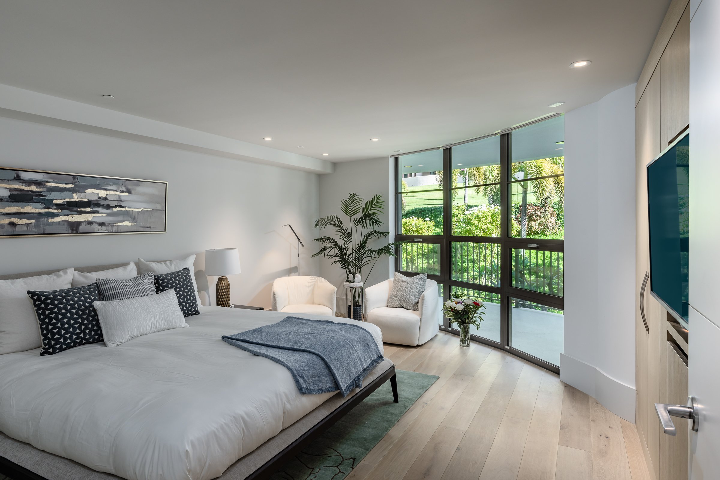 Inside, the contemporary design features European Oak wood flooring and high-end appliances, including a Wolf stove, Sub-Zero fridge, and Miele dishwasher. The open floor plan connects the gourmet kitchen to the living area, creating a seamless space for relaxation and entertaining.
