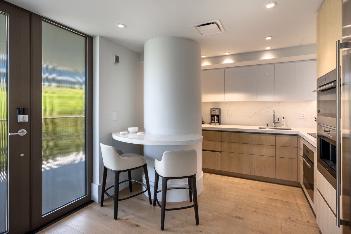 Features include pocket doors, European Oak engineered wood flooring, Coral stone accent wall, Milk oak panel accents, LED lighting, Nest AC control, Motorized shades & blackout, Subzero refrigerator, Wolf induction cooktop, microwave, oven and coffee machine, Miele dishwasher, Quartzite countertops, Asko washer & dryer, Built-in closets, and more.