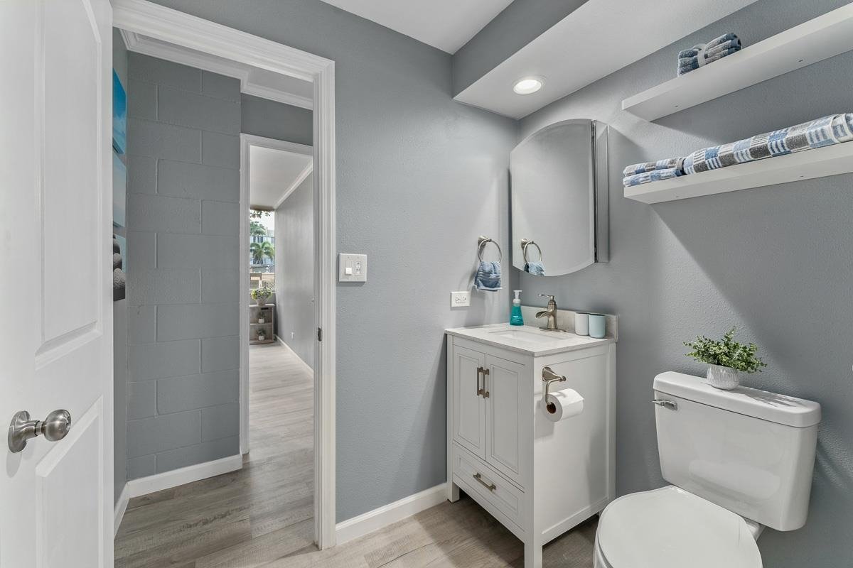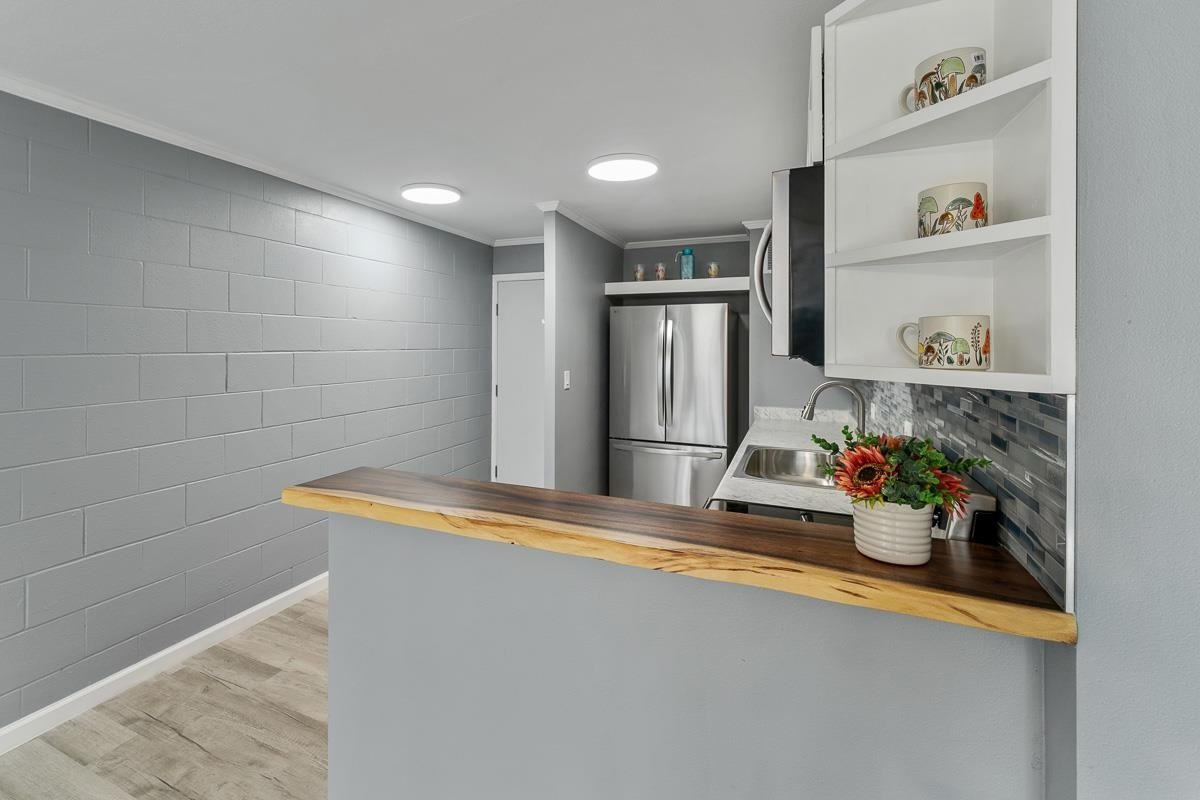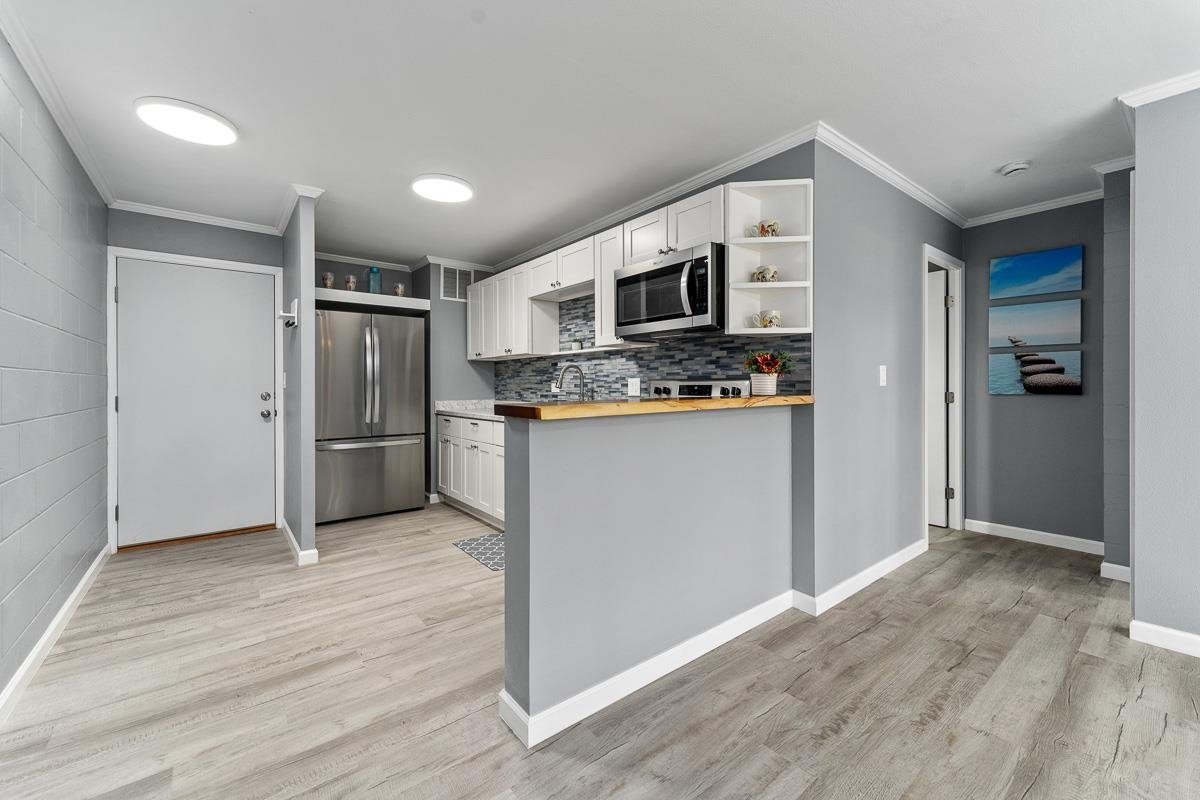 Seller Financing may be available for this ground-level 1 bedroom, 1 bath unit that has been thoroughly and elegantly renovated, showcasing a contemporary and refined design. The gorgeous Lifeproof vinyl plank flooring extends throughout the unit, complemented by crown molding that gracefully touches the newly painted walls and ceiling. Abundant natural light pours in through the expansive windows, highlighting every upgrade detail in the condo. The kitchen features butcher block bar countertops and white soft-close cabinets, making cooking effortless, while brand-new appliances enhance meal preparation. The bathroom offers a spa-like retreat with a tiled walk-in shower equipped with smart technology, including Bluetooth-enabled speakers, a vent, a night light and a large walk-in closet that may also be utilized as a storage space. The complex features a playground, basketball court, and a private pool surrounded by vibrant gardens, cool shady trees and a serene koi pond. Additionally, the property is conveniently located near the harbor, popular surf spots, medical facilities, schools, and delightful restaurants. This impressive unit is a ground floor unit with easy access to your assigned parking stall, just a short distance away. Enjoy the added privacy and tranquility of your secluded space in Harbor Lights.