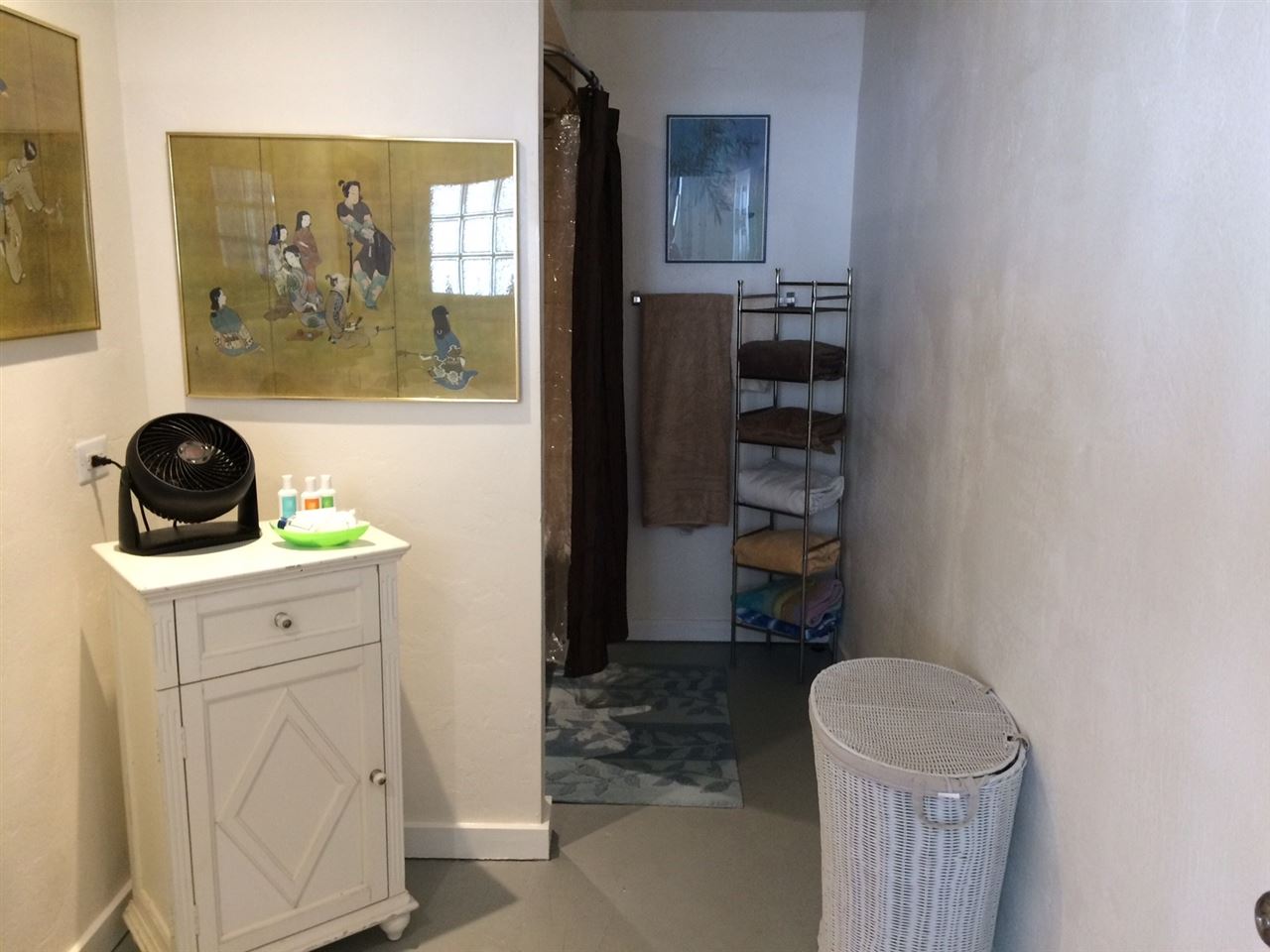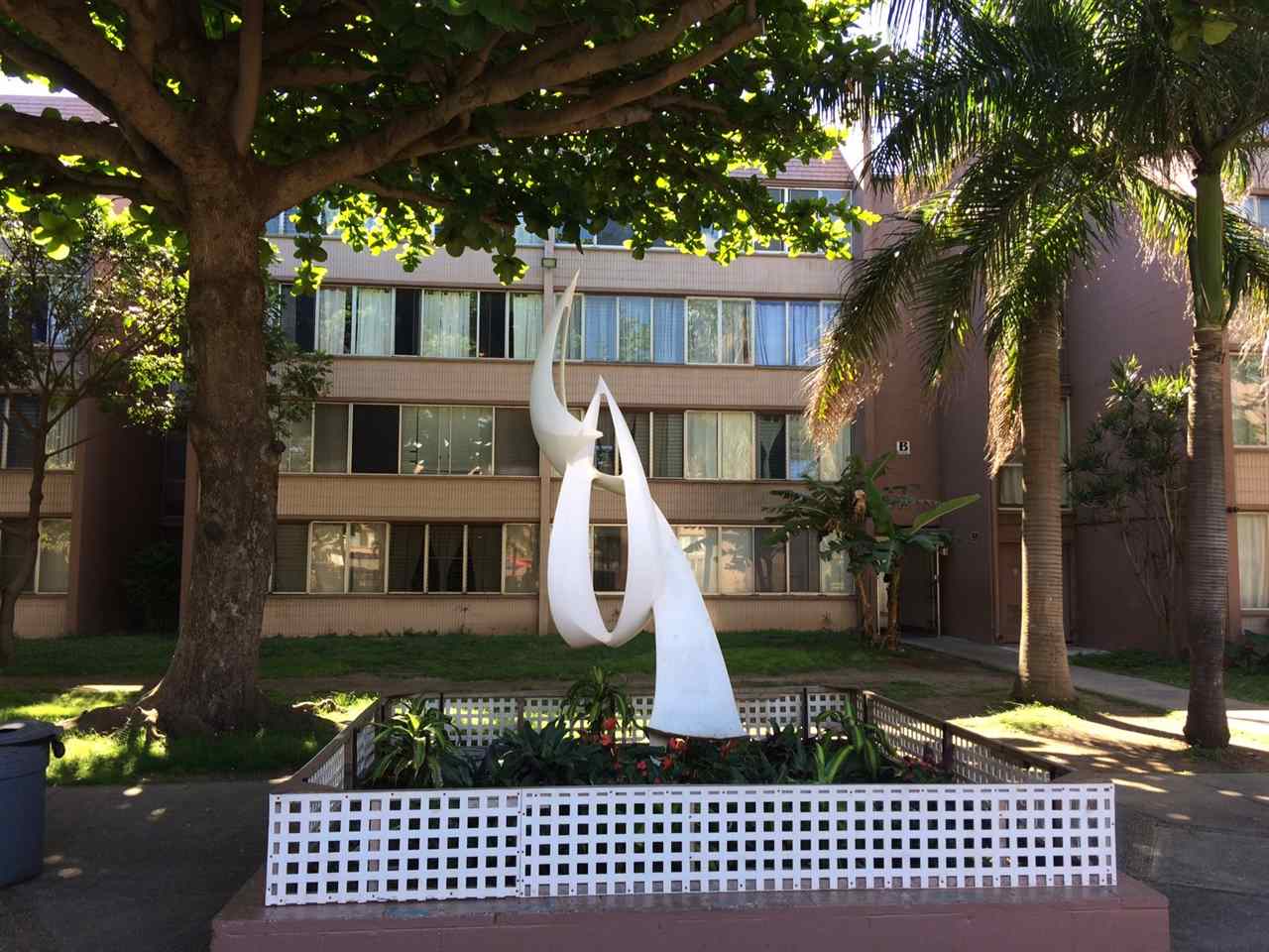 This furnished one bedroom unit has been converted to an open plan studio, fully and completely equipped for new owner to live in or rent out. Spacious, bright, this unit was completely re-done in 2012 with painted concrete flooring, flat ceiling with popcorn removed, walls smoothed, bathroom totally remodelled and expanded to include full bath. Kitchen features new also in 2012 includes counters, appliances and wood cabinets. Great easy location within B building, court yard facing, near elevators and laundry facility. Very strong solid rental history. Listor is owner. Parking spaces covered with new solar panel structure.