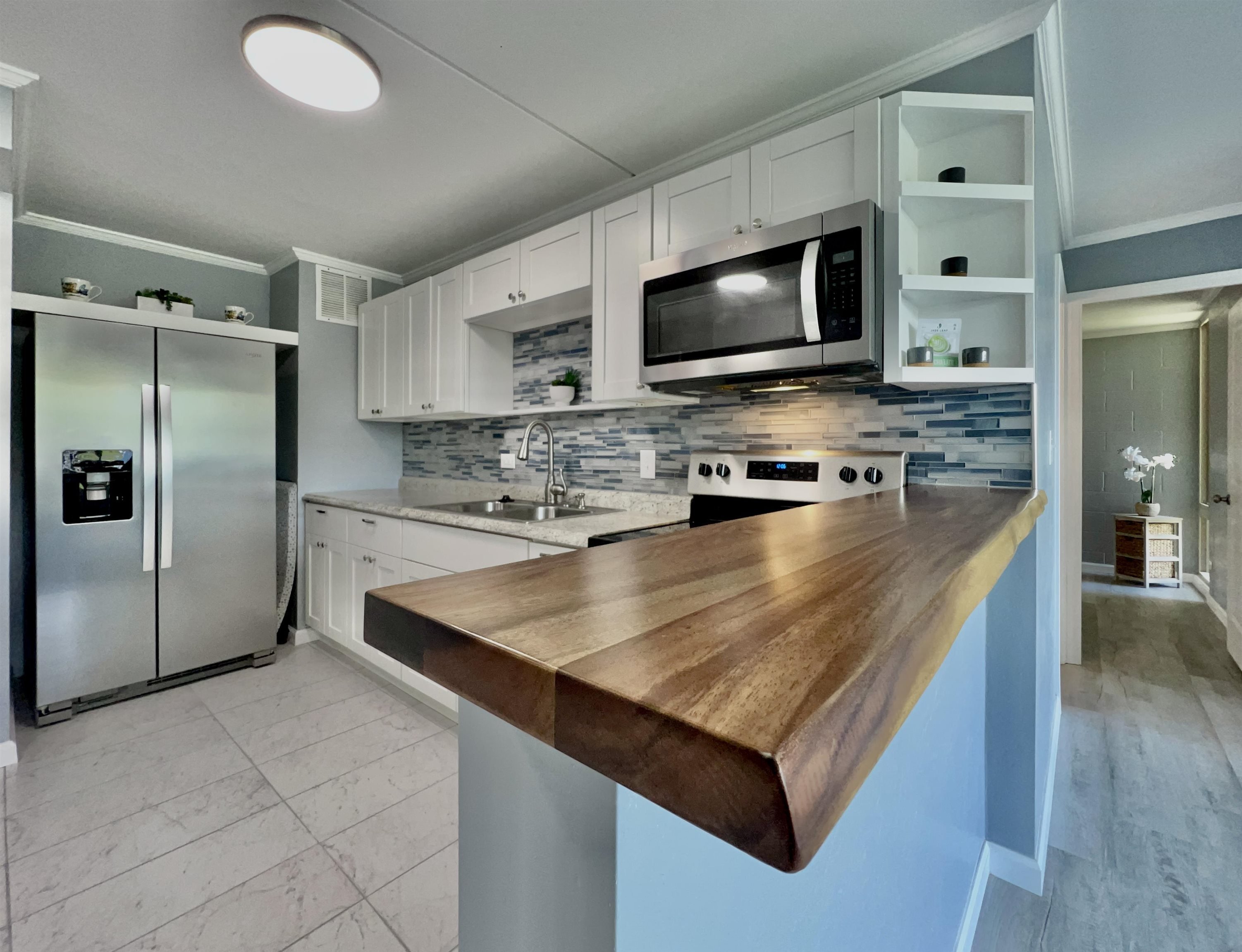 Welcome home to easy island living, only moments away from all the amenities that Central Maui is known and loved for! This beautiful ground floor unit at the Harbor Lights has been immensely remodeled above and beyond the surface, you will adore all the noticeably well-thought out features that this unit boasts such as the soft-close white drawers, cabinets, & countertops accented by the beautifully tiled backsplash in the kitchen. As soon as you enter this unit you will fall in love with a distinctive focal point, the natural vibe of the butcher block countertop, as it not only commands attention with it’s unique touch but also adds a functional flow. A smooth transfer from the tiled flooring in the kitchen to the luxury vinyl waterproof faux flooring throughout the entire property(easy maintenance,) completely brand new extra-large vinyl windows that allow lots of natural lighting and pleasant breezes in. Embrace the upgraded & large walk-in shower with natural pebbled flooring, tiled walls and the impressive blue-tooth enabled speaker installed into the bathroom light which is also equipped with a night light mode & bathroom vent. Entertain your guests in the spacious living room or invite them to embrace the sun out in the pool, barbecue area or simply enjoy the serenity of the koi pond in the courtyard. Can you imagine a Harbor Lights Unit more move-in ready? Contact your go-to Realtor to schedule a showing today!