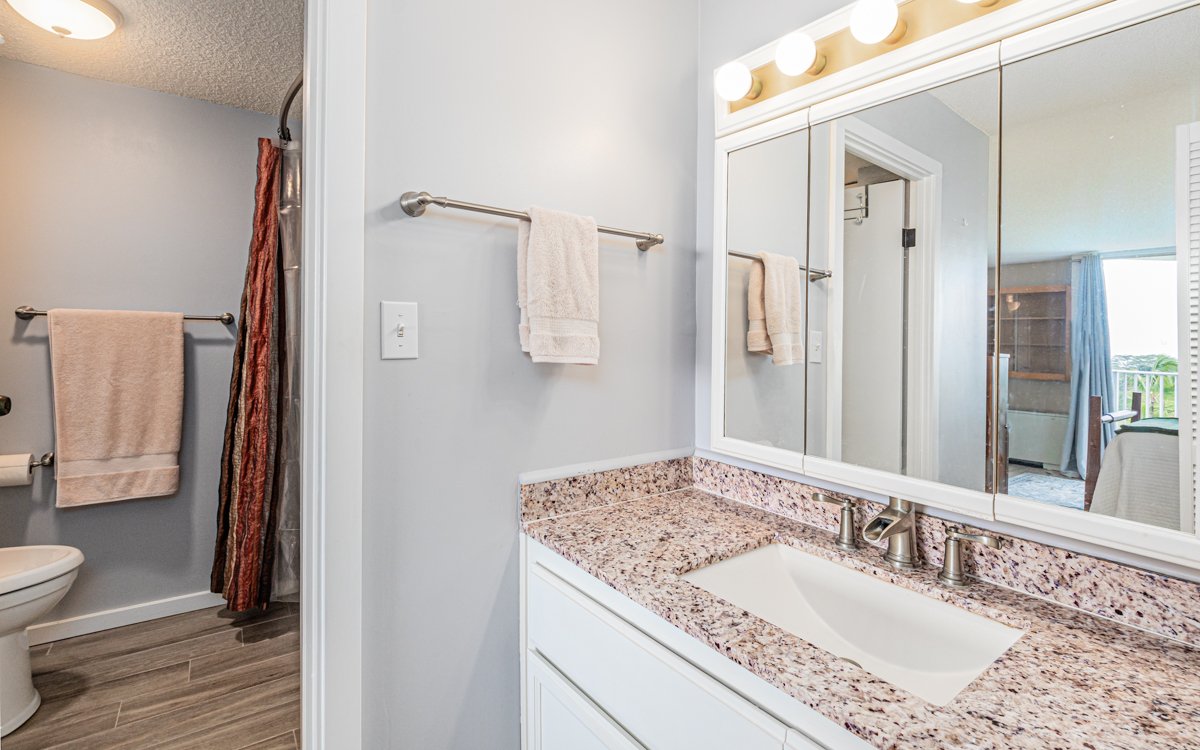 The floorplan of the condo optimizes privacy with the full kitchen and living room in the center. The kitchen has stainless appliances including a full size refrigerator, range/oven, and dishwasher. Each side of the unit hosts a bedroom with en-suite bathroom and plenty of closet spaces. Both bathrooms have been renovated. One boasts a fully tiled walk-in shower and the other retains a bathtub/shower combo. The kitchen has original small tile countertops. Upgraded ceramic tile flooring goes throughout the condo except in the living room and hallway where you'll find lovely bamboo plank floors. The entire unit is air conditioned through 3 air handlers.