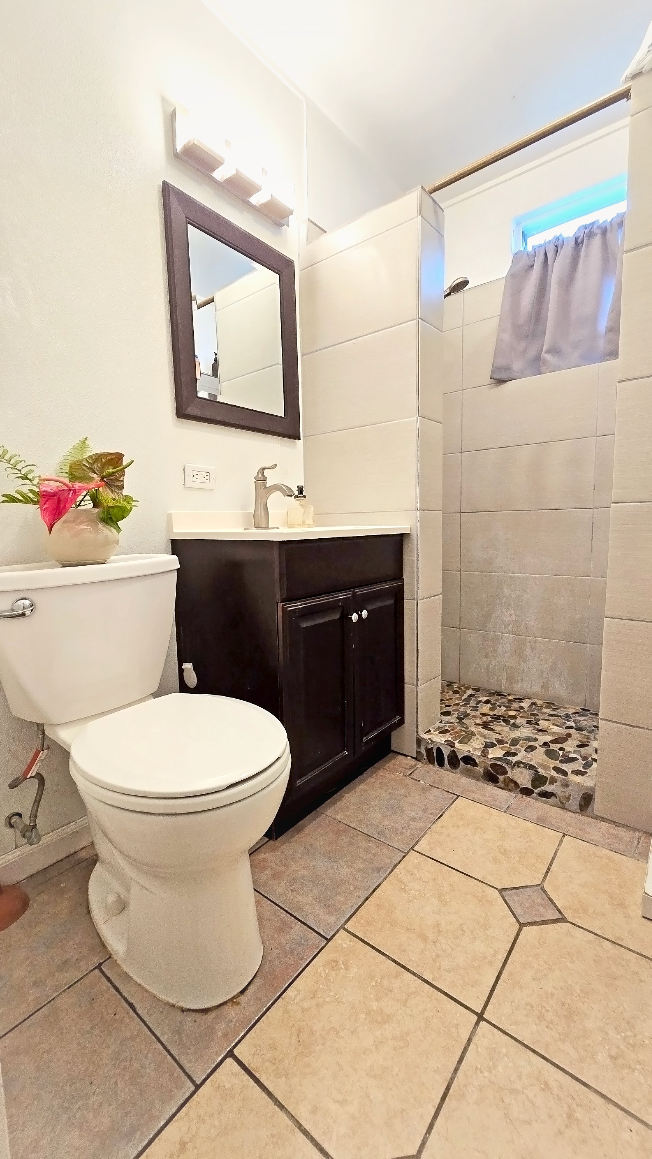 The unit has been tastefully updated, with renovations in 2019 that included fresh paint throughout, new laminate flooring, a revamped kitchen with updated butcherblock counters, a new tile shower, and a modern vanity.