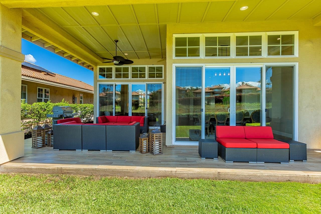 Hokulani Golf Villas Unit 103 is tasteful, elegant, & most importantly comfortable in every way. As you enter, through the 8-foot tall mahogany & cast glass front door, a feeling of 'quiet spaciousness' & a 'sense of welcome' is apparent. The volume of space & scale imparts a sense of balance. 12-foot high ceilings are delineated with an understated double band of white-on-white crown moulding. Gorgeous draperies, 12 feet in height, accentuate the space while the 8-foot tall glass sliders & clear story windows above invite an abundance of light. Floor-to-ceiling architectural columns & a wall of windows define the den area, while the linear vitreous porcelain wood-like flooring lends warmth throughout. Friends & Family can comfortably Share & Be Together in this epitome of 'A Great Room' while culinary efforts are underway in this chef's dream kitchen. Specimen granite kitchen counters bordered by the porcelain tiled full-height backsplash complement the walnut kitchen cabinetry. All appliances are KitchenAid rendered in stainless steel. Seating for 10 is easy in the semi-formal glass-walled dining area which seamlessly opens to a large outdoor living area. The ground-floor primary bedroom has large bay windows & an en-suite bath with a walk-in closet & custom built-ins. Upstairs, a central den area affords an abundance of uses & 2 amply-sized guest bedrooms share a lovely full bath. A 32-panel solar array powers the home & charges 2 Tesla Power Wall battery backups. A 250-gallon propane gas tank feeds the 5-burner Cook-top, Rinnai on-demand Tankless hot water heater & exterior lanai BBQ hook-up. This gated property has a lovely panoramic ocean & outer island view pool, spa, & BBQ pavilion & affords proximity to world-class beaches, shopping, dining, golf, & Maui's convenient airport & central business district. ***Also Listed under Single Family MLS 403440.