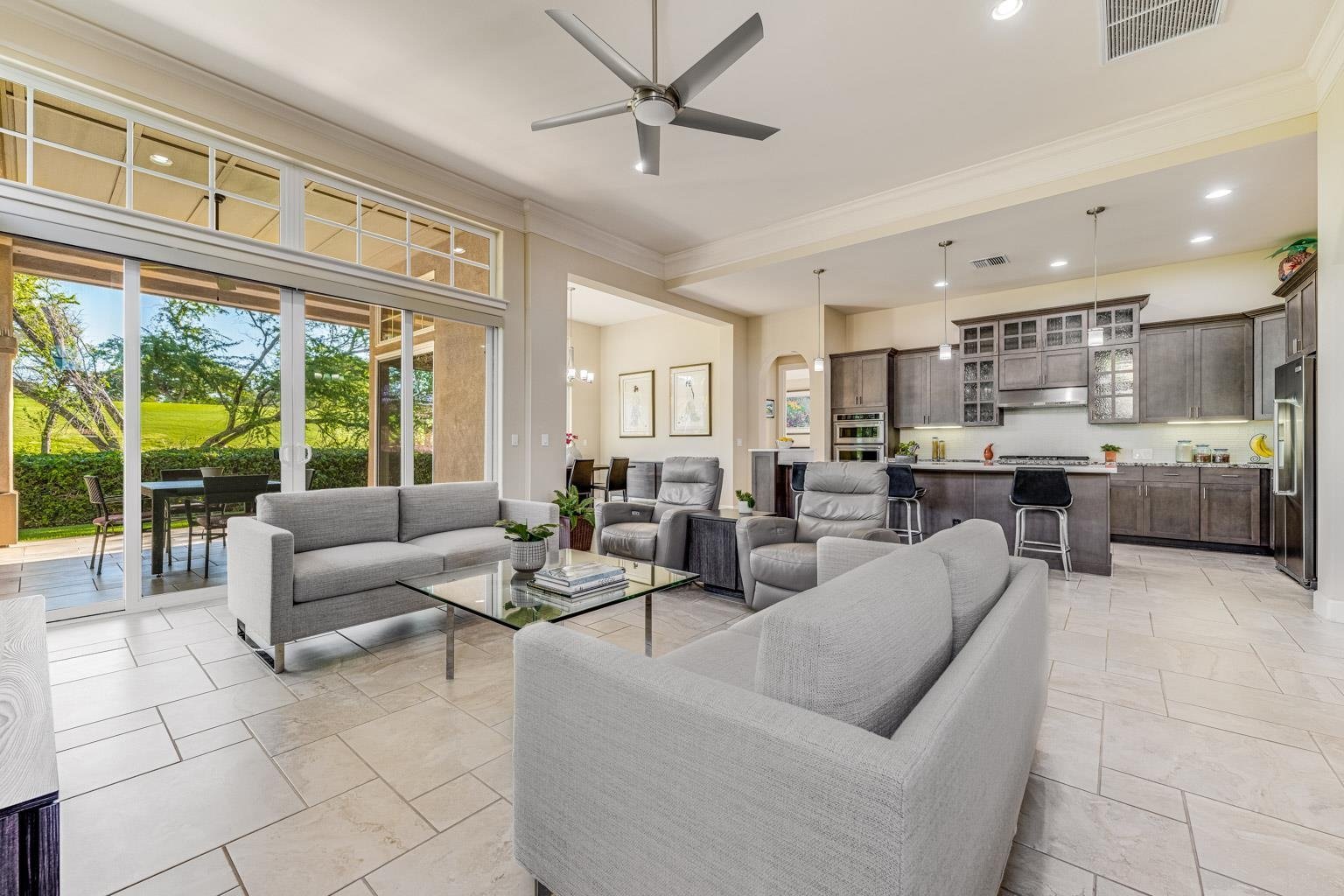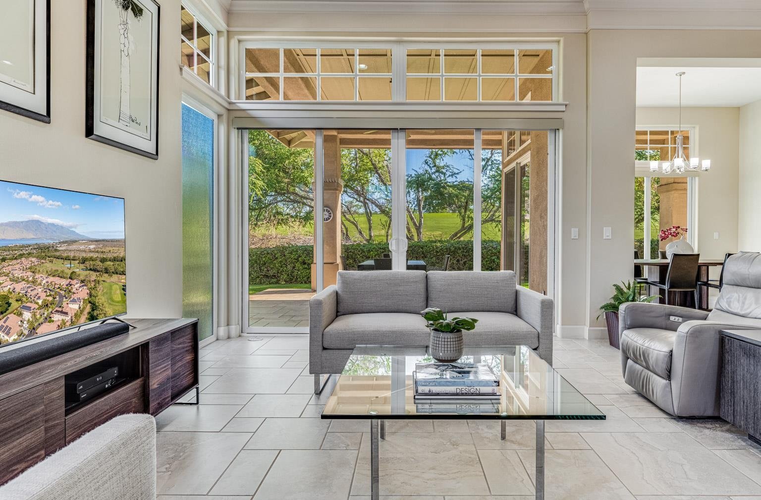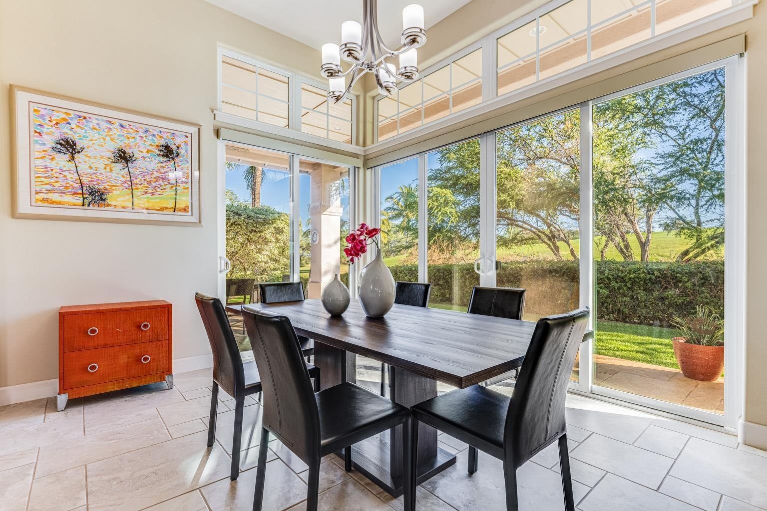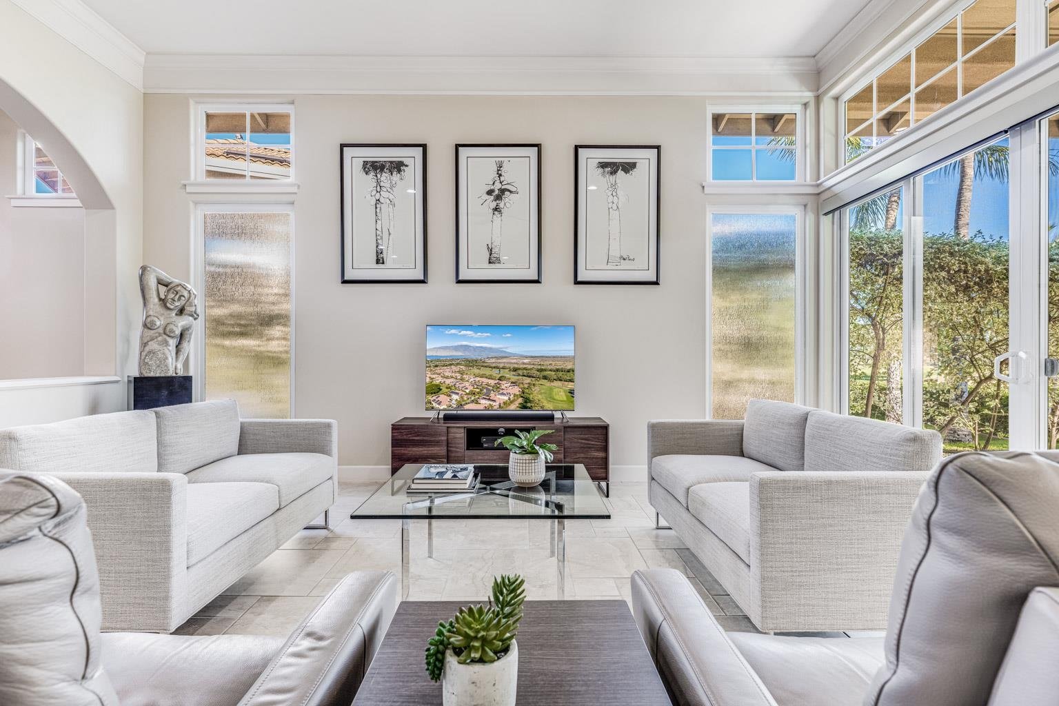Immaculately maintained this single level home consists of 2 bedrooms 2 baths and a den all on a single level. The best part is the floor to ceiling glass with soaring 12 foot ceilings creating a "grand & elegant home" The location fronts the tee box at the 17th hole with a backdrop to Mr. Haleakala. Away from potential road noise the setting is serene and peaceful. The Sellers love to take their coffee on the covered lanai in the morning and listen to the birds. This gated community boasts single family residences in a condominium lifestyle, the maintenance fees include landscaping so you never have to lift a finger sit back and enjoy the Hokulani lifestyle. The home is being sold fully furnished with the exception of artwork. The home is turnkey and ready for you to move in. Call your realtor today to arrange for a showing.