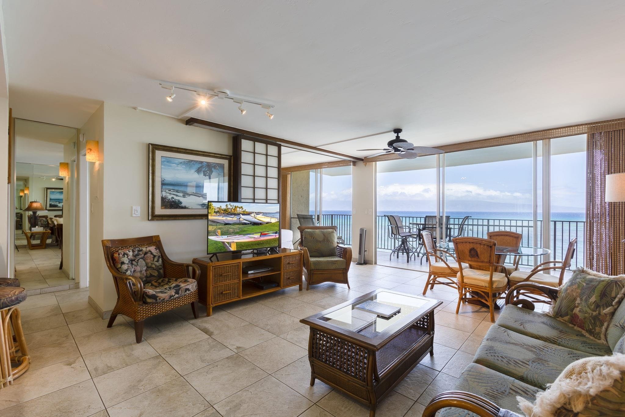 Desirable end unit location in the 04 stack, 2 bed, 2 bath, furnished, with point blank views of ocean, Molokai and Lanai, whales and turtles. Two lanais, with good setback from other units. No noisy window or vents to outside walkway; quiet except for surf. All on one level, sizable owners closets, quality tile floor, pet friendly. Hololani has 64 units, heated swimming pool, BBQ’s, sunning area. Designated underground parking space and storage. Surfing, windsurfing, beaches all nearby. Excellent vacation rental or residence. Sold fully furnished and turnkey. Current seawall assessment, contact your agent for details. Fee simple. H-2 zoning for short term rentals