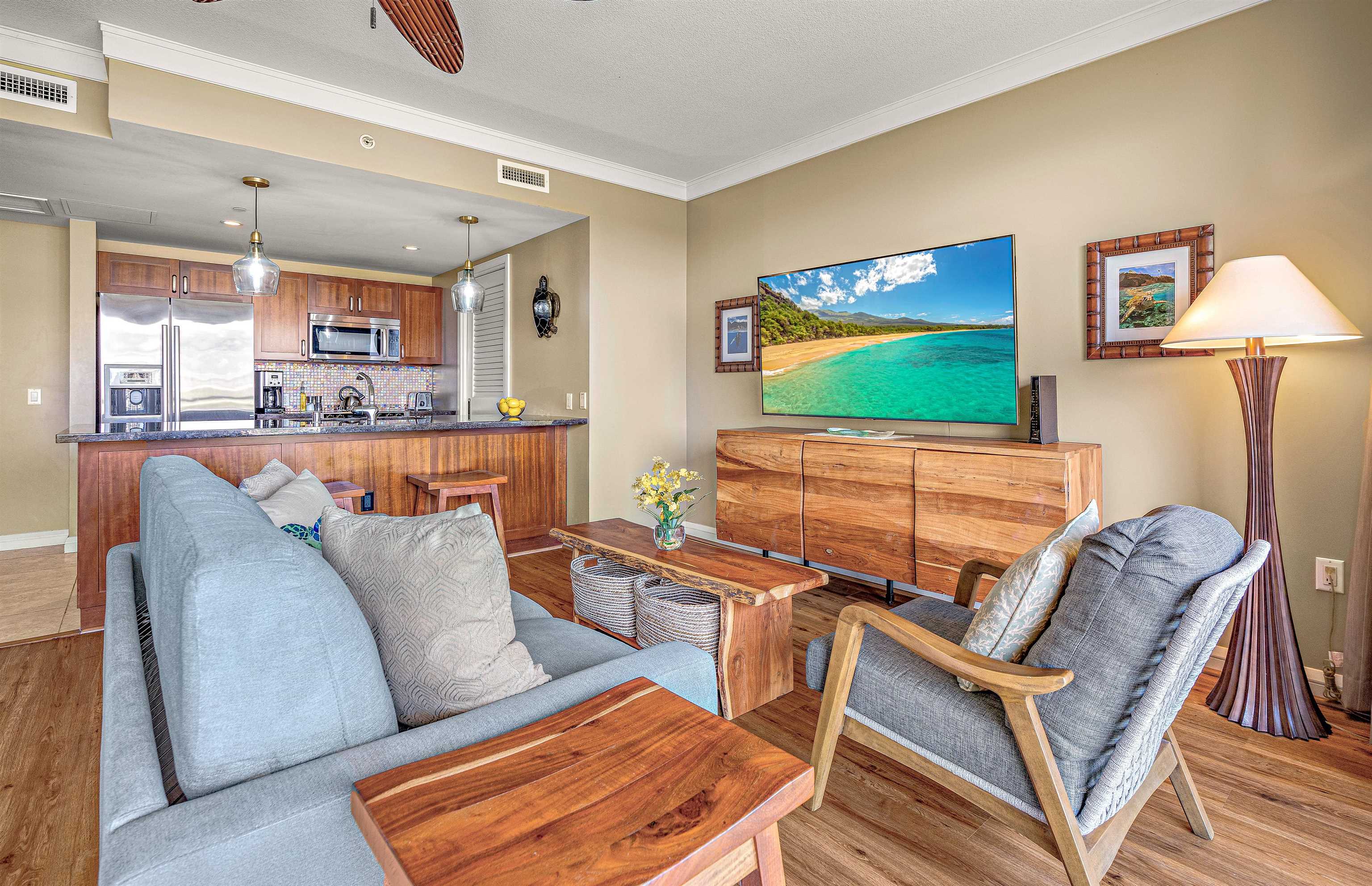 Rarely does a 700 sq ft one-bedroom partial ocean view home become available for resale at Honua Kai. This home offers both magnificent West Maui Mountain views in addition to a great partial Ocean View of Moloka’i. North facing and tucked into a protective corner makes this home poised for great rental demand. Quiet, away from the pool activities and hustle bustle, H538 offers a cool northern exposure with no direct sun beating down on you as you enjoy your lanai experience. Newer upgrades include wood look vinyl flooring, living room furniture, Bosch Washer/Dryer and TV’s. Honua Kai amenities include 3 distinct swimming pools, 5 hot tubs, valet and underground parking, concierge service, HOA owned work out facility, Ho'ola Spa and of course, Dukes Beach House. This is certainly a “must see” if you’re looking for a one bedroom with views!