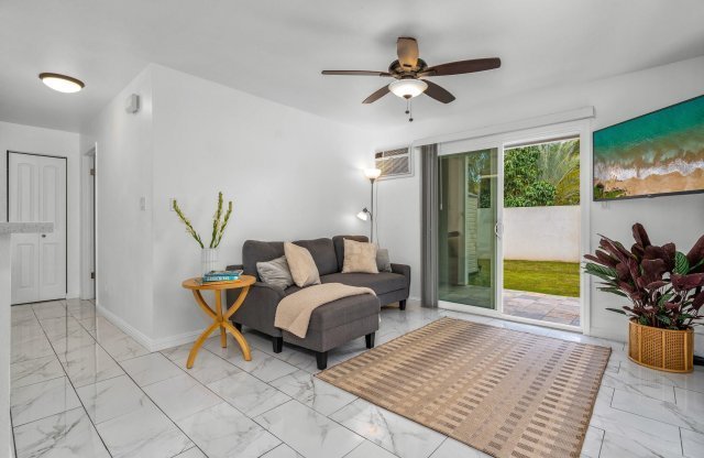 This highly desired ground floor unit offers the perfect blend of space and affordability. With a generous 960 sqft layout featuring 3 bedrooms and 2 bathrooms, this updated corner townhouse provides comfort and privacy in a tranquil part of the complex. The newly sodded yard is completely fenced and pet friendly. There is also a covered lanai, an exterior storage closet, and two assigned parking stalls. This unit underwent a complete upgrade in 2019, and is well-maintained, freshly painted, and move-in ready! Central location to grocery stores, schools, restaurants, parks, hiking trails, beautiful beaches, and surfing spots. Whether you're looking to build equity for the future or generate rental income, this turn-key unit is a fantastic investment opportunity. Schedule your appointment today.