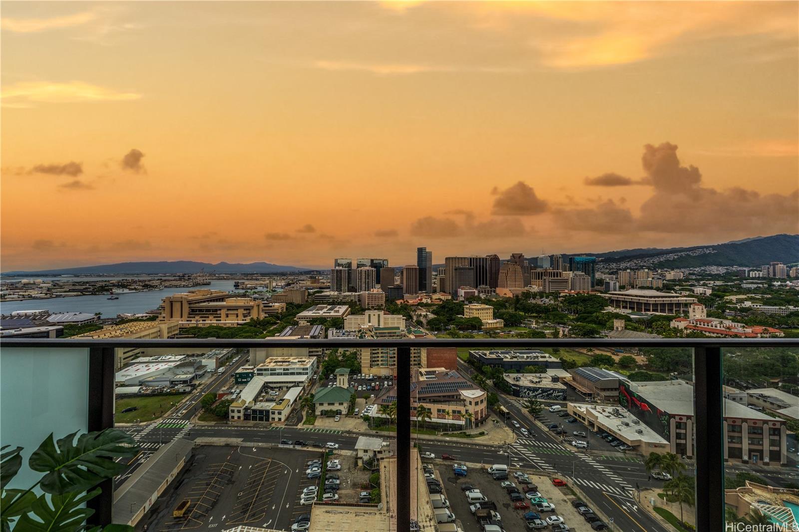 Beautiful Sunset view , Newly renovated 2-bedroom, 2-bath Corner unit with 2 covered tandem parking stalls, located in the heart of Kaka'ako. This newly completed 2024 residence features professional new LVP flooring throughout, tile flooring on the patio, Glass Shower doors, and plantation windows with blinds, creating a clean, modern aesthetic. Enjoy sweeping views of Downtown Honolulu, the lush mountain backdrop, and the iconic Aloha Tower from this well-positioned corner unit. The building offers an impressive array of resort-style amenities, including a multipurpose room, splash pool, BBQ areas, community garden, putting green, outdoor cinema, bicycle and surfboard workshop, and a beautifully designed co-working space.