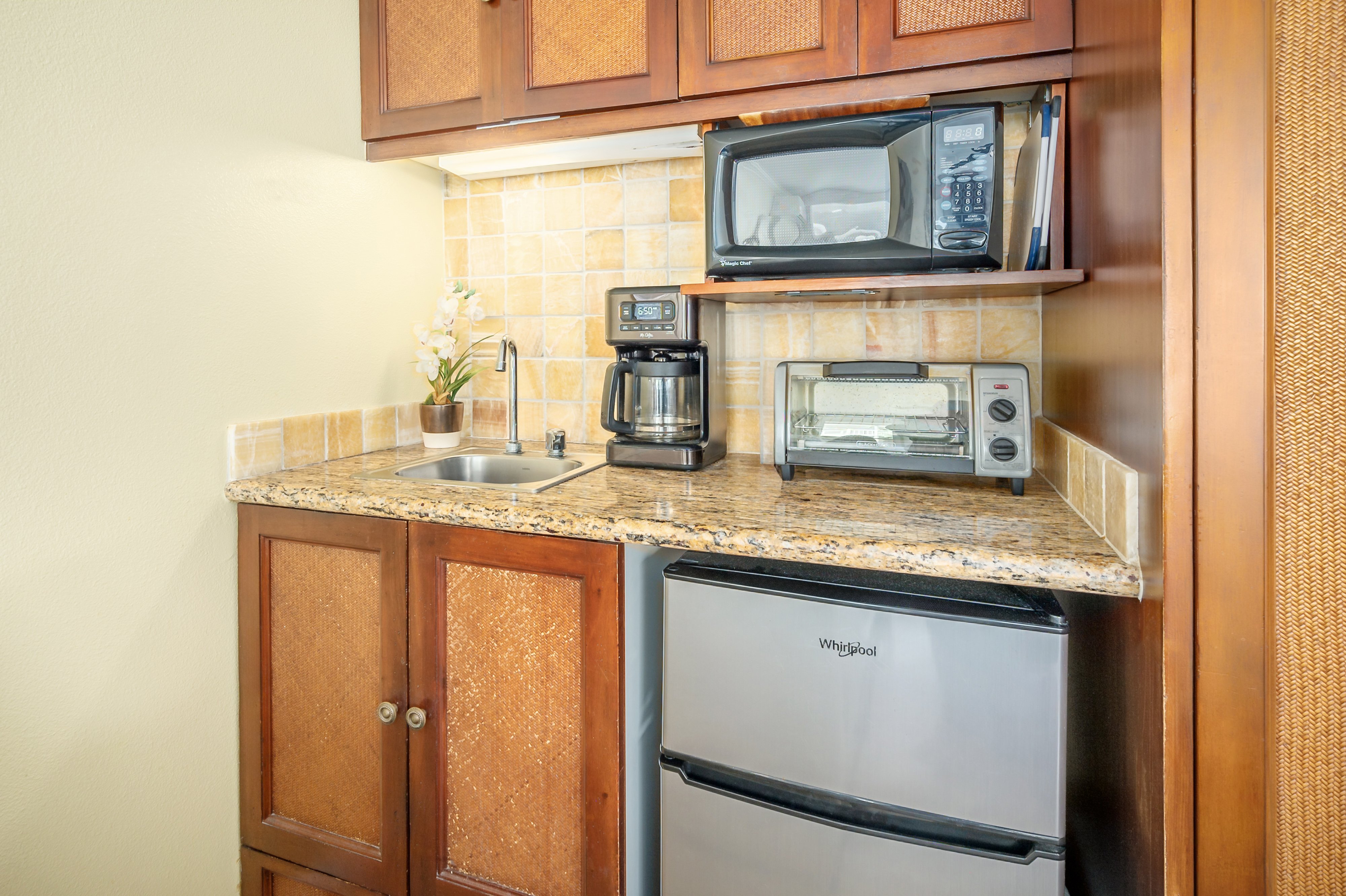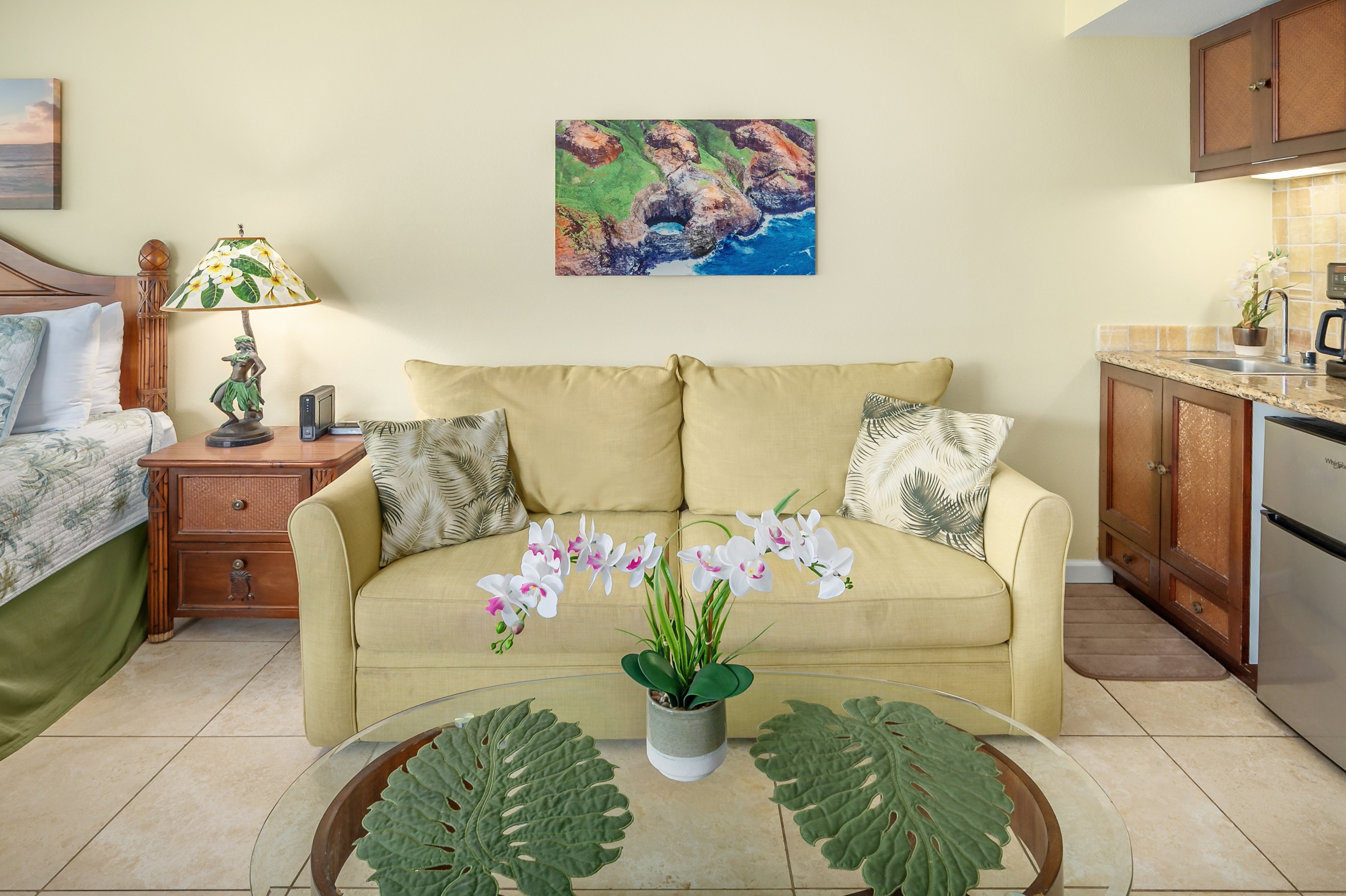 Second floor studio unit with king bed and full-sized sleeper sofa, completely furnished. Partial ocean view and fully stocked kitchenette with micro fridge, microwave, toaster oven, coffee maker and tea kettle (no cook-top).