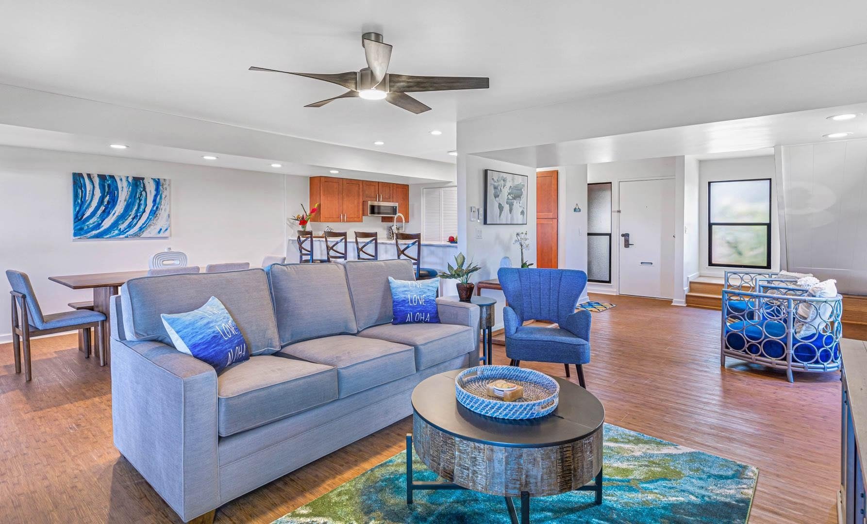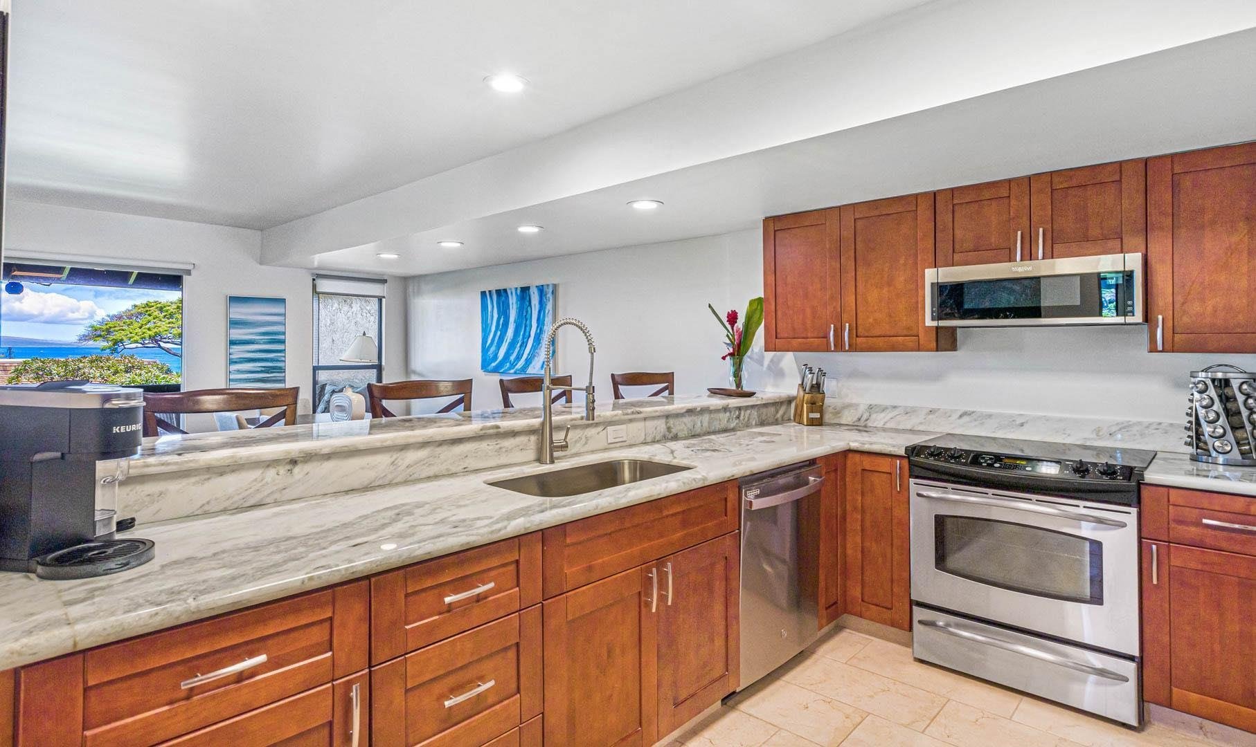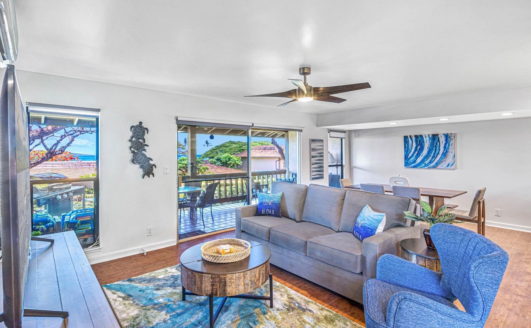 Residence #32 has just undergone a substantial ‘21 remodel and the designer staging perfectly accentuates the large space and its ocean and outer island views. KP #32 is a two story residence with the living (queen pull out sleeper sofa) , full kitchen, 3/4 bath and laundry, as well as a covered lanai with ocean views on the ground floor. Surfaces include brand new stainless appliances, quartz counters, new tile work, bamboo flooring, and new smooth wall sheet rock work. Upstairs lives all three bedrooms with the Master and en suite bath as well as it’s own private covered lanai (views) on the ocean side whereas the second bedroom is a mountain view with a queen bed, and the third bedroom (mtn. view) has a triple decker bunk bed. Guests of this successful short term rental love being able to walk directly across the street to Kahekili (Airport Beach) which has ample picnic tables, bbq areas, sprawling lawns, and a magnificent beach for walking, swimming, snorkeling, and epic whale and sunset watching. Also note that Castaway Cafe is within this walk-able area and all that Kaanapali has to offer is a few minutes drive away. Inventory is included in the sale.