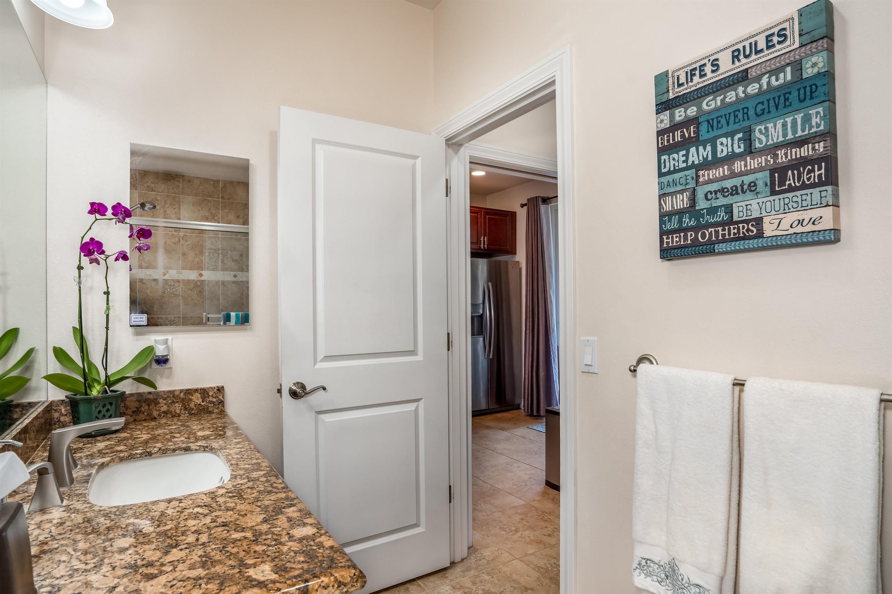Welcome to Kai Ani 4-106/206. Kai Ani Village is one of the best kept secrets in Kihei. This is one of only twenty "live/work" townhome condos in South Maui located one block from 7 miles of uninterrupted beach and sunsets! This condo is located on the desirable Lipoa Street side with excellent street frontage in the complex. The ground-floor work/office space is complete with a separate address and mailbox and includes en-suite half bathroom. The work space can be rented out separately or used by the owner for a multitude of purposes. The main living area located on the second floor has 16 foot high vaulted ceilings. The main living area includes the kitchen, the second bedroom, guest bathroom and a full-size washer and dryer. The large gourmet kitchen has granite counters, stainless appliances, pantry cabinets, an oversized sitting bar and bar cart area. Enjoy your morning view looking at the slopes of Haleakala from your private covered lanai. The primary bedroom located on the upper level has a large walk-in closet with tall dresser, an oversized en-suite bathroom with granite counters and dual sink vanity and large tiled shower. The Five-way split system AC (in the main living area and the primary bedroom AC was replaced in 2022). This townhome condo comes with a two car garage which is rare on Maui (for a condo complex). The resort-like swimming pool, jacuzzi and BBQ area have views of the south side of Haleakala. Conveniently located near Central Kihei Restaurants, Shopping, Banking & a wide variety of Activities