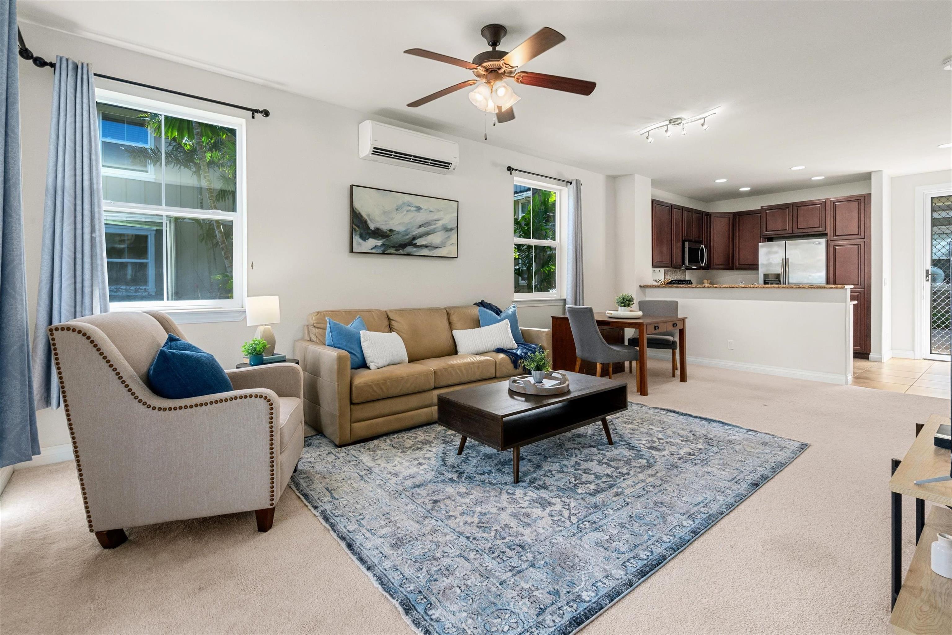 Step into Kai Ani Village Unit 6-101, a beautifully furnished 2-bedroom, 2-bath condo that offers both the convenience of modern living and the tranquility of island life. Spanning 1,032 square feet, this unit is perfectly equipped for immediate move-in, featuring brand new kitchen appliances (stove, microwave, dishwasher, and refrigerator) that promise a seamless culinary experience from the moment you arrive. The covered lanai provides an outdoor space to enjoy Maui's beautiful climate, while the secured garage offers peace of mind for your vehicle and beach essentials. The sale also includes a Reserved Parking Stall specifically for this unit. Beyond the comfort of your home, Kai Ani Village enchants with its lush, inviting common area landscaping, alluring pool, hot tub, and BBQ area, ensuring every day feels like a vacation. Strategically nestled in the interior of the complex, this unit is shielded from the hustle and bustle of South Kihei Road, offering a quiet haven amidst the vibrant surroundings. Just blocks from the beach and minutes from shopping, dining, and essential services, you'll find the perfect balance of serenity and convenience. Discover the ideal setting for your new island lifestyle at Kai Ani Village Unit 6-101, where peace, comfort, and convenience converge. PLEASE NOTE: Some items seen in the photography are used for professional staging purposes and may not be included in the sale. A detailed list of the inventory will come with the sale and provided during the escrow process, ensuring clarity and transparency for all parties involved.