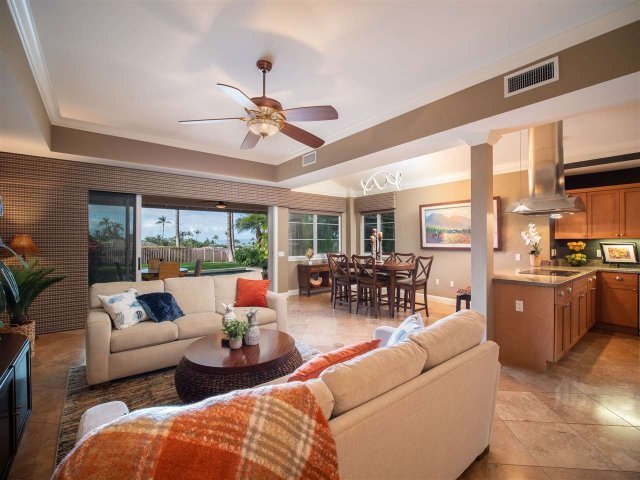 The spirit of adventure brought you to this place of extraordinary serenity and your Maui dream come true awaits at Kai Malu #57-B! Mesmerizing ocean views from the oversized lanai with fenced yard, overlooking a sparkling private pool, the Wailea Blue golf course to the cobalt blue sea crowned by outer islands. Handsome travertine tile extends thru out downstairs and large lanai where the open concept living harmonizes with your Maui indoor/outdoor lifestyle. The warm, inviting kitchen with granite countertops and stainless GE appliances foreshadows the quality time you’ll spend with loved ones. Stylish art deco lighting lends the dining area a distinctive flair. The perfectly designed 3 bedrooms and 2.5 baths feature a master suite boasting electrifying ocean and outer island views. The master lanai provides panoramic views of the azure Pacific with outer islands, golf course and majestic Haleakala. The en suite master bath features dual vanities, soaking tub and separate shower. The inviting secondary suite utilizes a stately hall bath with walk-in shower. The third bedroom features flexible built-ins by Maui Closets with Murphy bed plus desk area. Kai Malu life is exceptional, offering one of the most gorgeous community pools in Wailea, recently updated gym and more. Private, yet so close to shopping, restaurants, and world class beaches. Seeking the perfect way to enjoy Maui? This Is It.