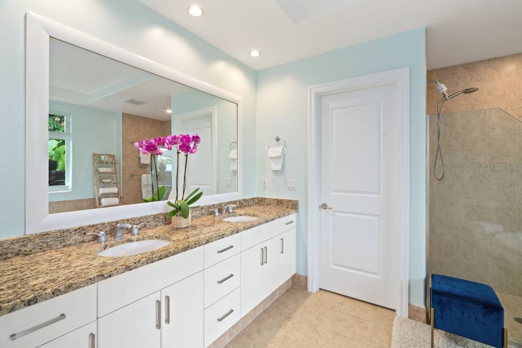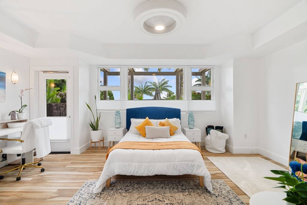 Just bring your toothbrush and a bathing suit, all the hard work has been done for you. Every inch of this turnkey 1738-square-foot Ka’iulani Coastal Villa has been meticulously remodeled using the highest-quality materials, craftsmanship, and organic mid-century design aesthetic. Each level has its own bedroom with double vanity ensuites and walk-in closets. The upper level also enjoys a high architectural cut-out ceilinged living room and an impeccably reimagined kitchen that features quartz countertops, a custom acacia wood bar and appliances by WOLF and Subzero. The open concept maximizes the light and lush tropical views from large southeast-facing windows. The large upstairs primary bedroom also features an integrated computer workspace/home office if you wish to mix some work with your play. The oversized lower-level bedroom also offers its own lounging and workspace retreats with a jetted tub and a private shaded lanai.